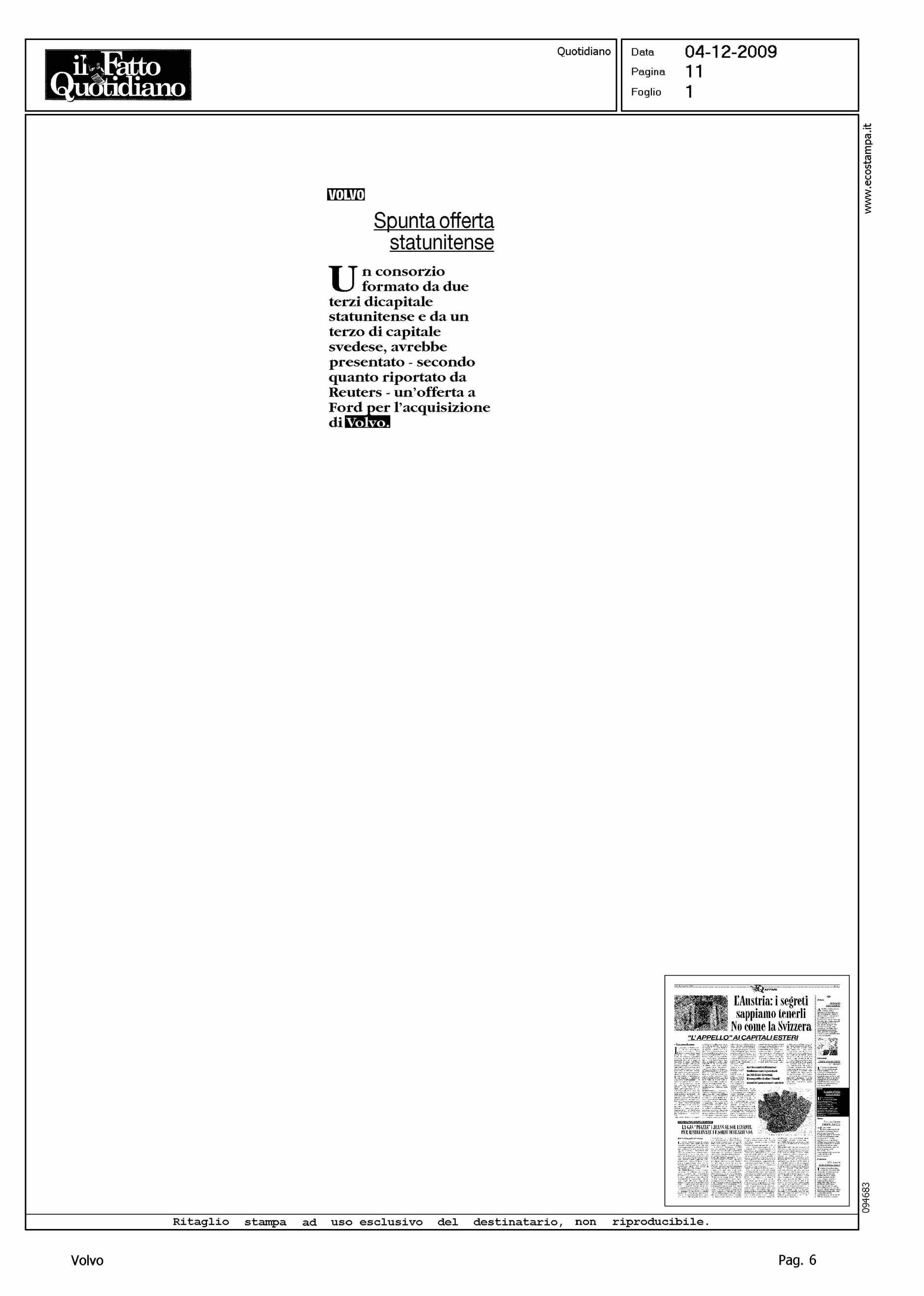 Author: Line: Corporate Model: Corporate Subject: - Title: VOLVO - SPUNTA OFFERTA STATUNITENSEHighlight: OFFERTA DA SOCIETA' USA/SVEZIA
