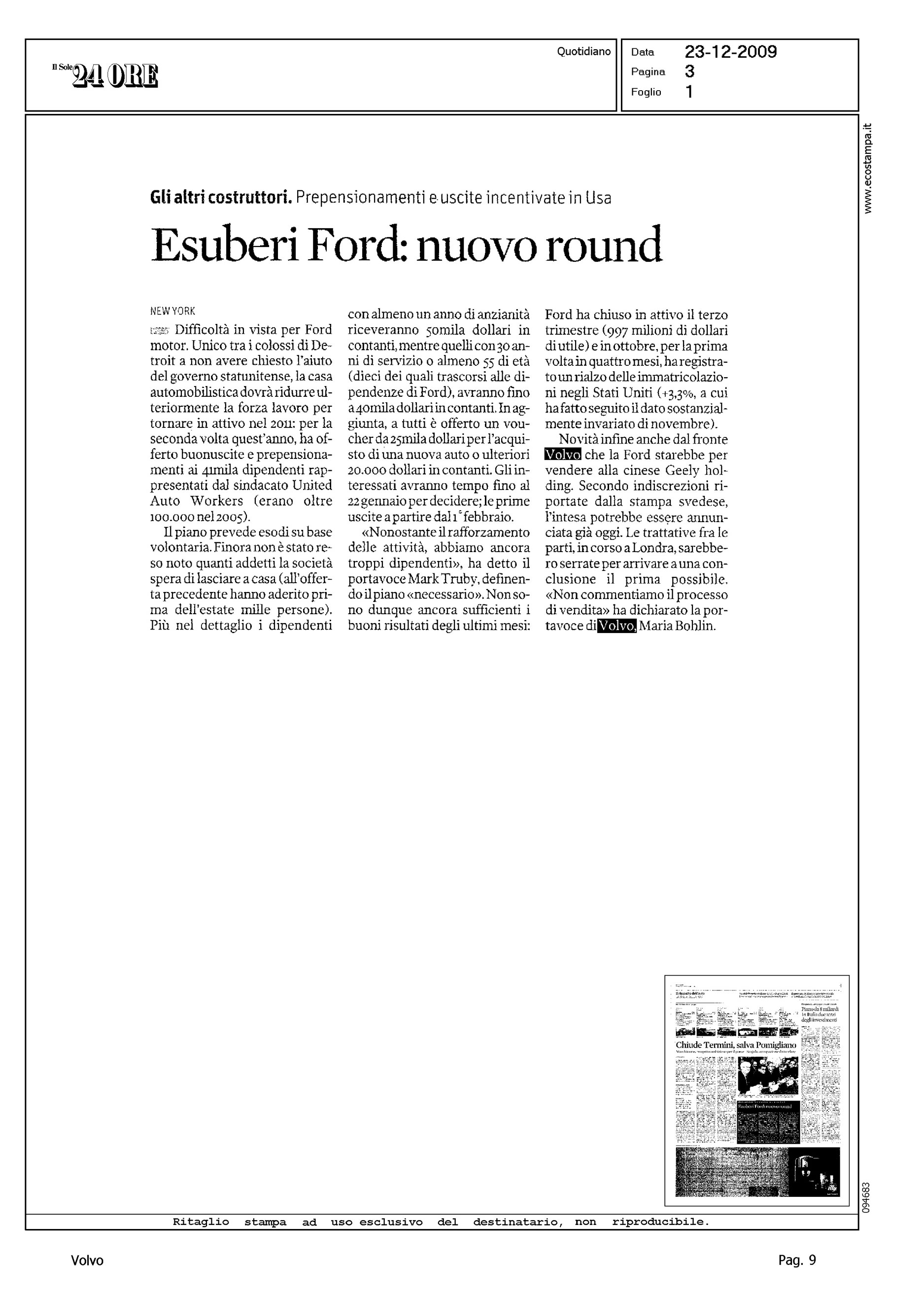 Author: Line: Corporate Model: Corporate Subject: - Title: GLI ALTRI COSTRUTTORI. PREPENSIONAMENTI E USCITE INCENTIVATE IN USA - ESUBERI F.: NUOVO ROUNDHighlight: VENDITA VOLVO ALLA GEELY, TRATTATIVE IN STADIO FINALE