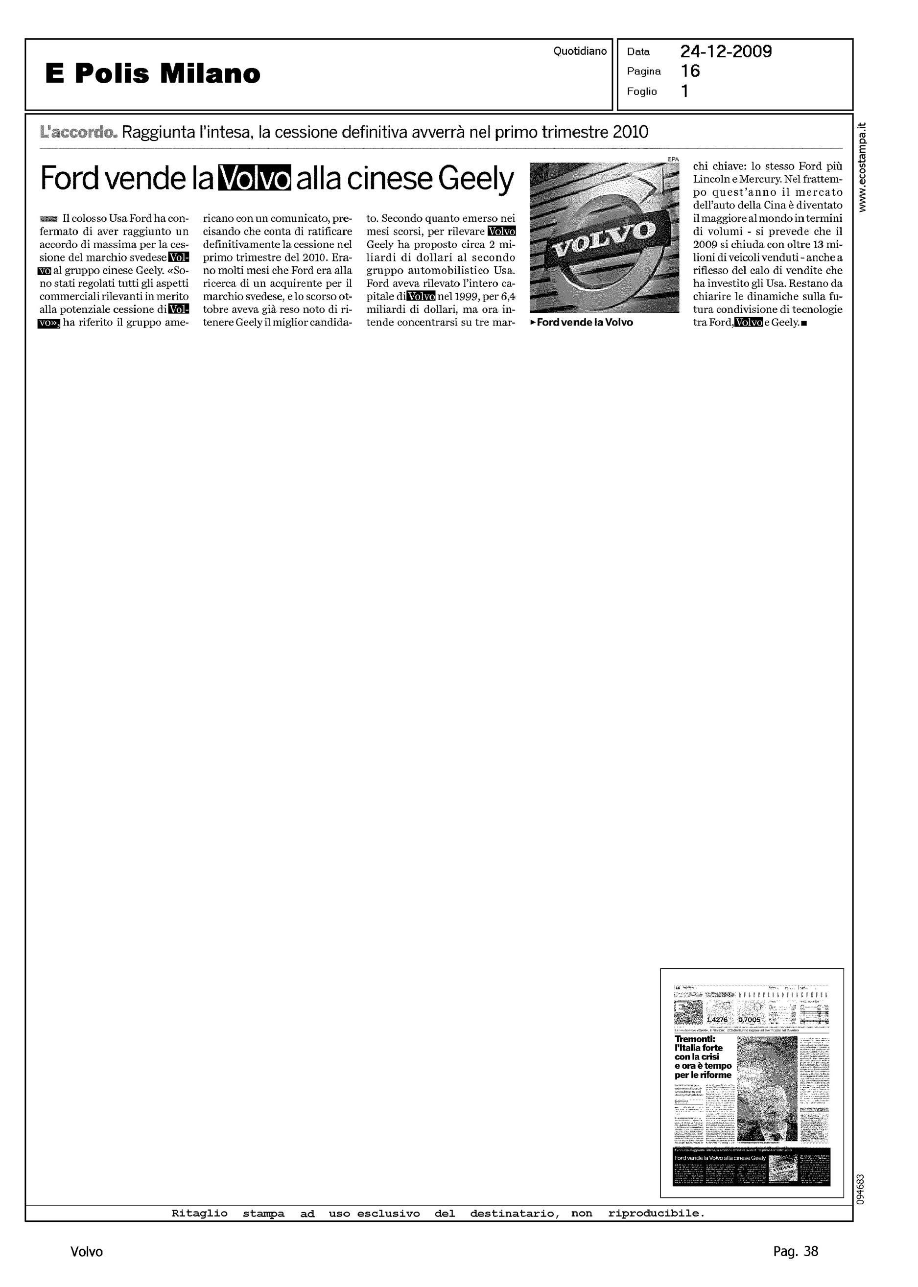 Author: Line: Corporate Model: Corporate Subject: - Title: FORD VENDE LA VOLVO ALLA CINESE GEELYHighlight: VENDITA VOLVO ALLA GEELY