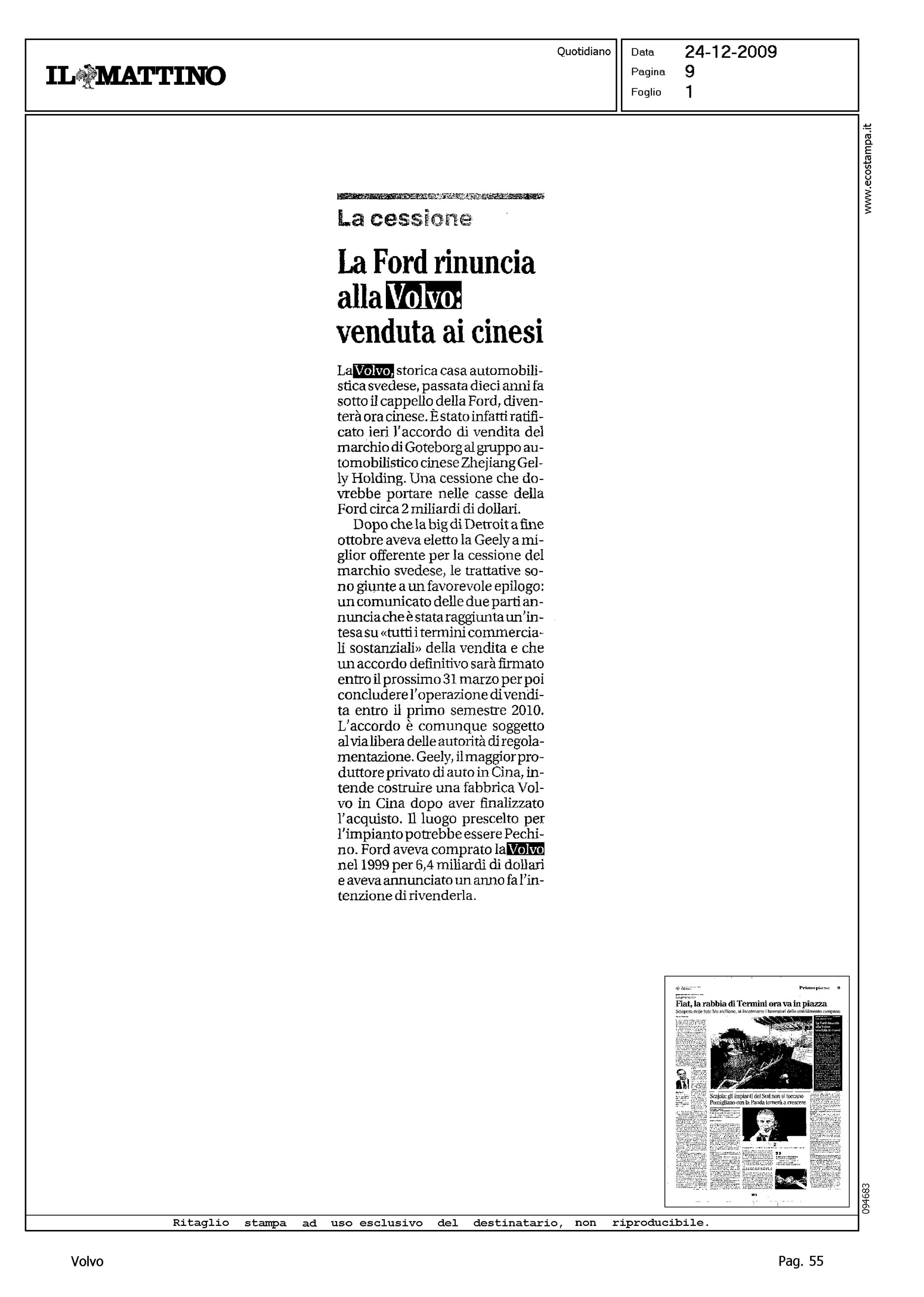 Author: Line: Corporate Model: Corporate Subject: - Title: LA FORD RINUNCIA ALLA VOLVO: VENDUTA AI CINESIHighlight: VENDITA VOLVO ALLA GEELY