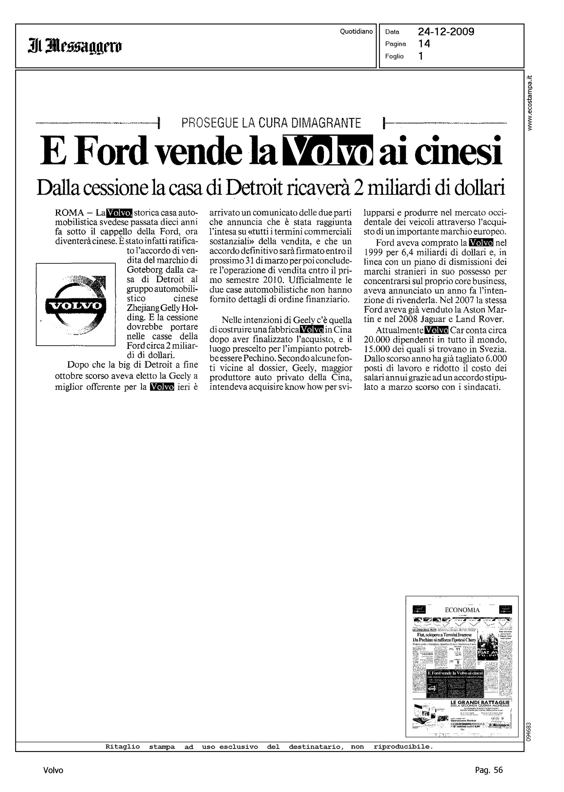 Author: Line: Corporate Model: Corporate Subject: - Title: E FORD VENDE VOLVO AI CINESIHighlight: VENDITA VOLVO ALLA GEELY
