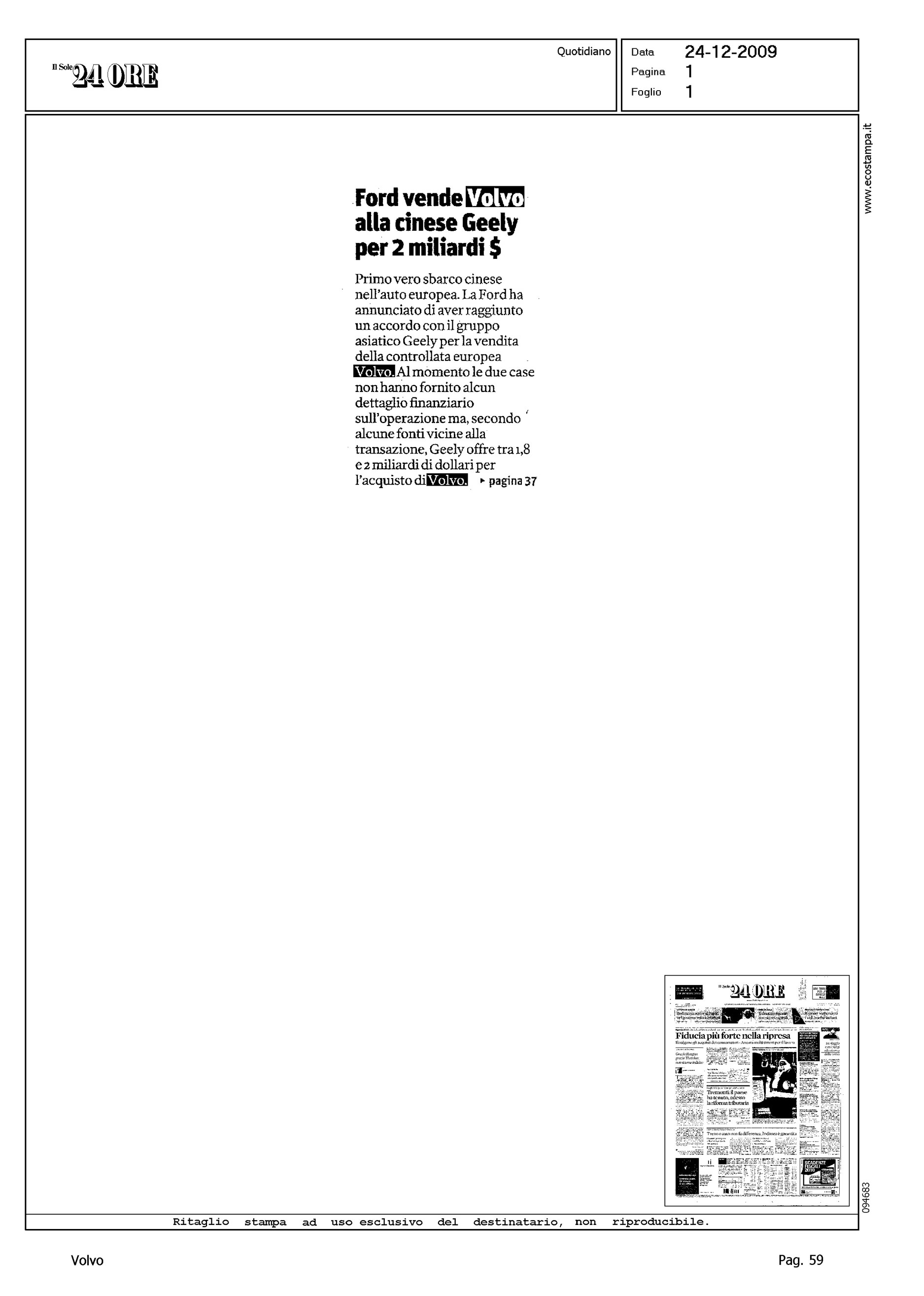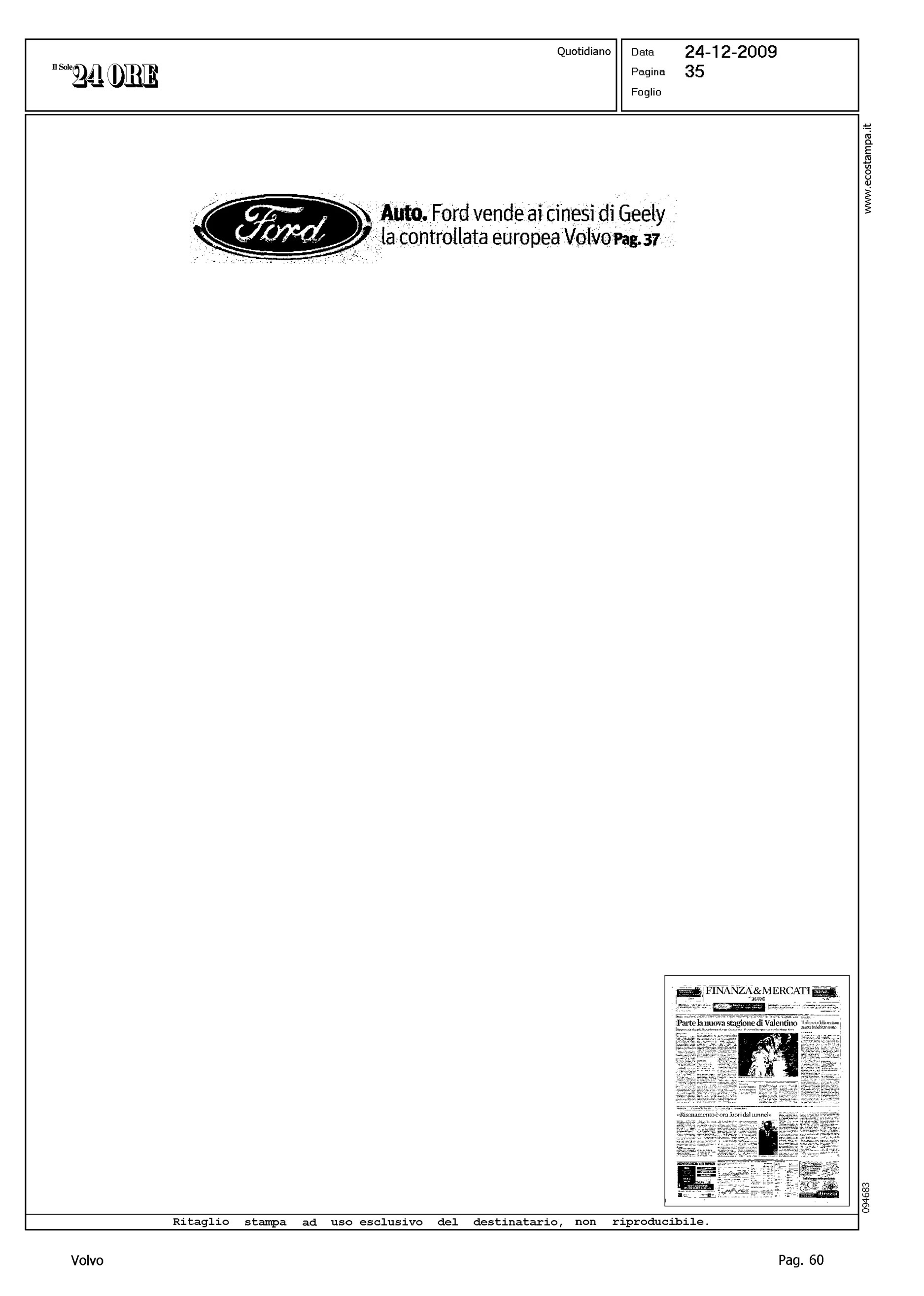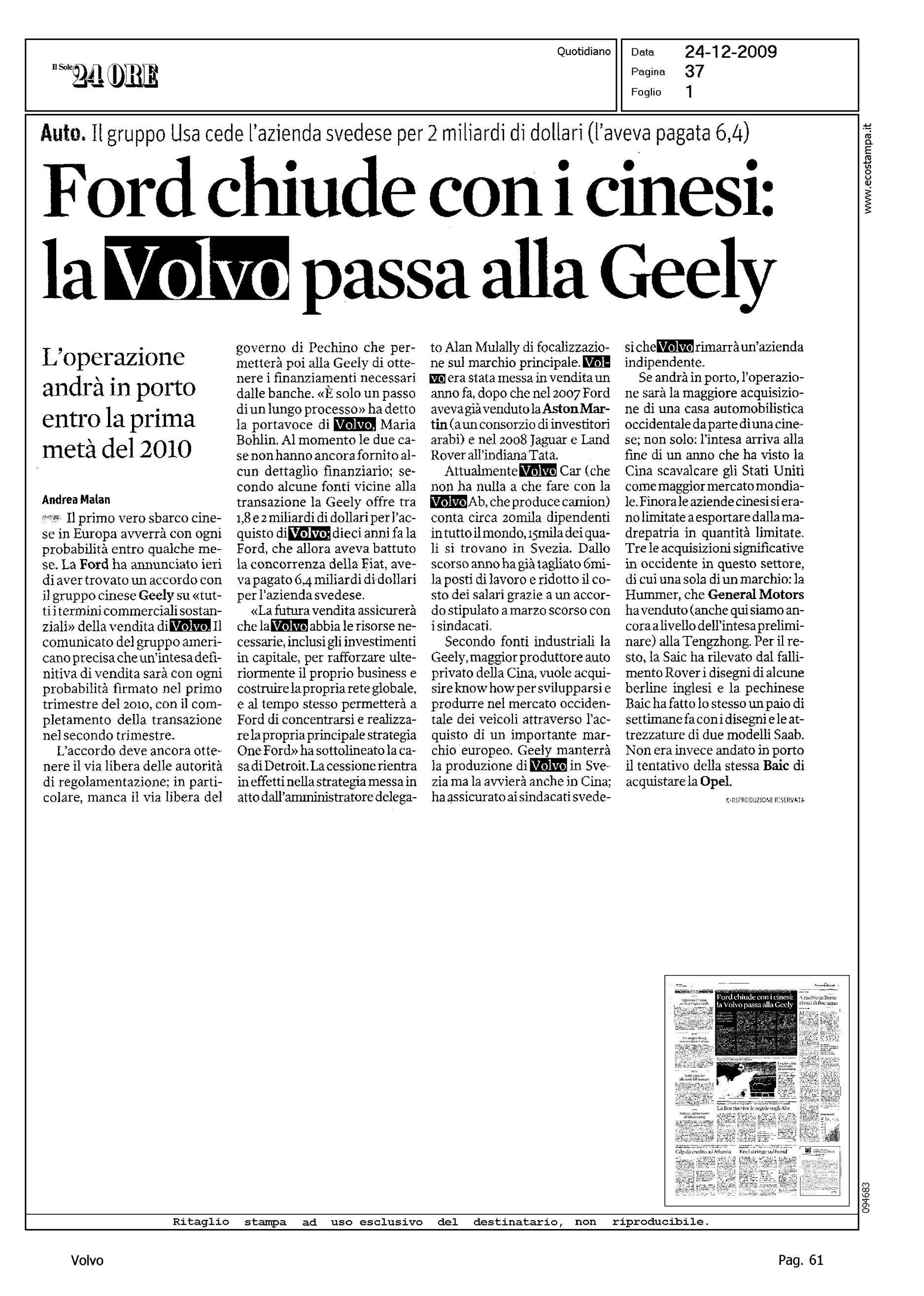Author: MALAN, ANDREALine: Corporate Model: Corporate Subject: - Title: FORD CHIUDE CON I CINESI: LA VOLVO PASSA ALLA GEELYHighlight: VENDITA VOLVO ALLA GEELY