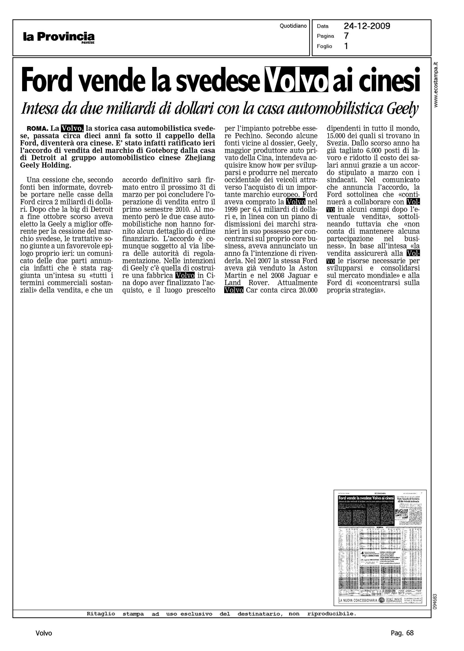 Author: Line: Corporate Model: Corporate Subject: - Title: FORD VENDE LA SVEDESE VOLVO AI CINESIHighlight: VENDITA VOLVO ALLA GEELY
