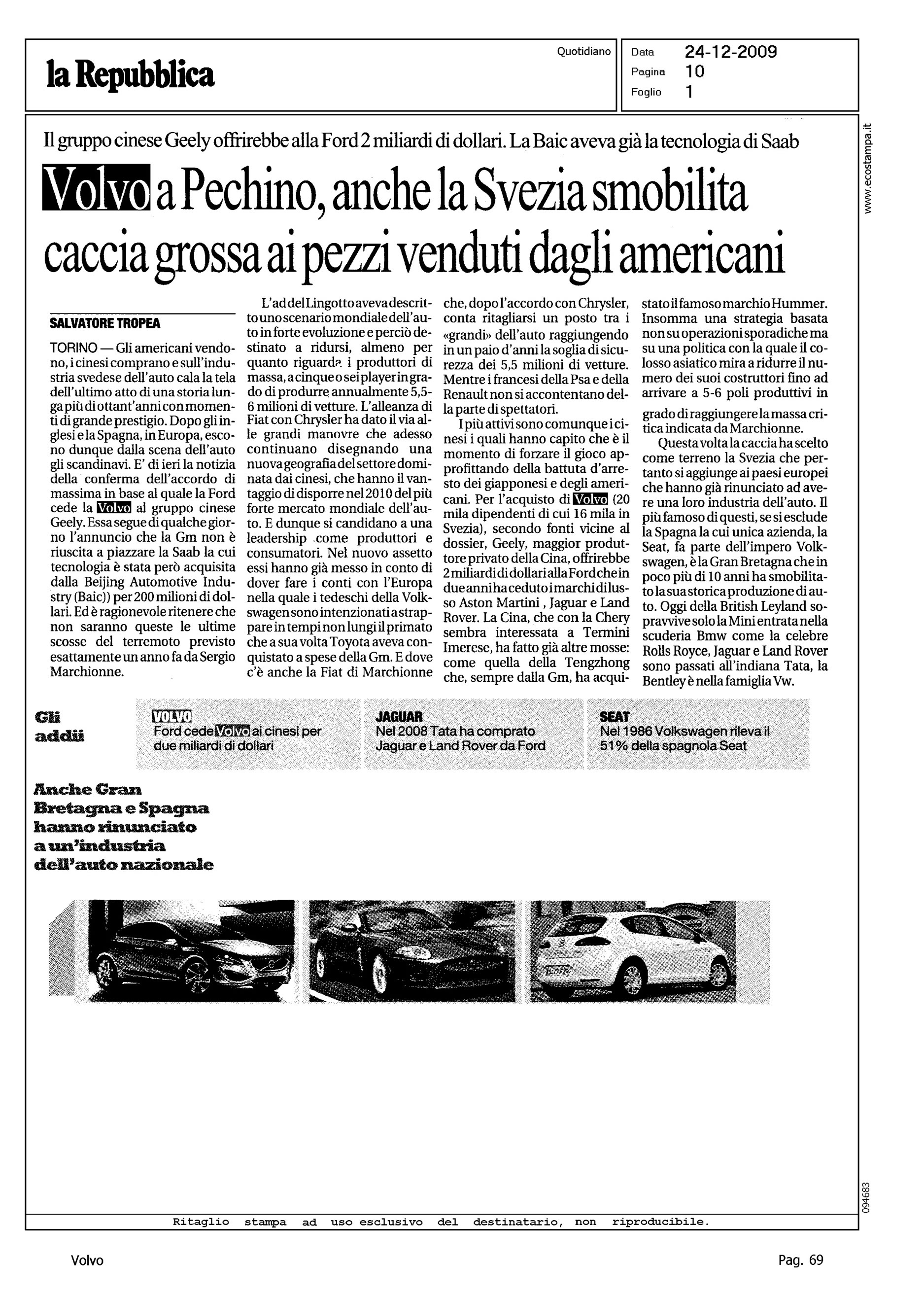 Author: TROPEA, SALVATORELine: Corporate Model: Corporate Subject: - Title: VOLVO A PECHINO, ANCHE LA SVEZIA SMOBILITA CACCIA GROSSA AI PEZZI VENDUTI DAGLI AMERICANIHighlight: VENDITA VOLVO ALLA GEELY