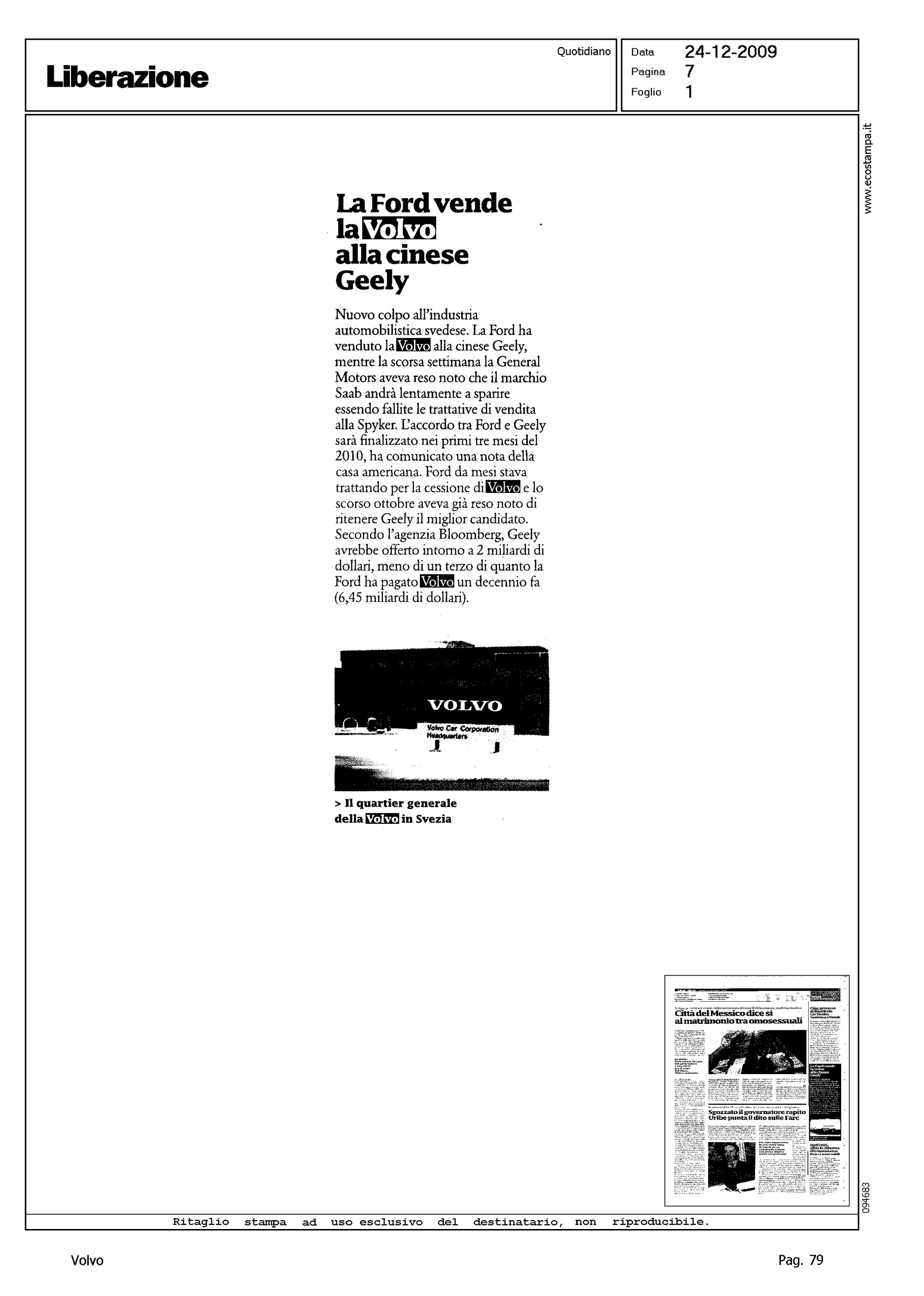 Author: Line: Corporate Model: Corporate Subject: - Title: LA FORD VENDE LA VOLVO ALLA CINESE GEELYHighlight: VENDITA VOLVO ALLA GEELY