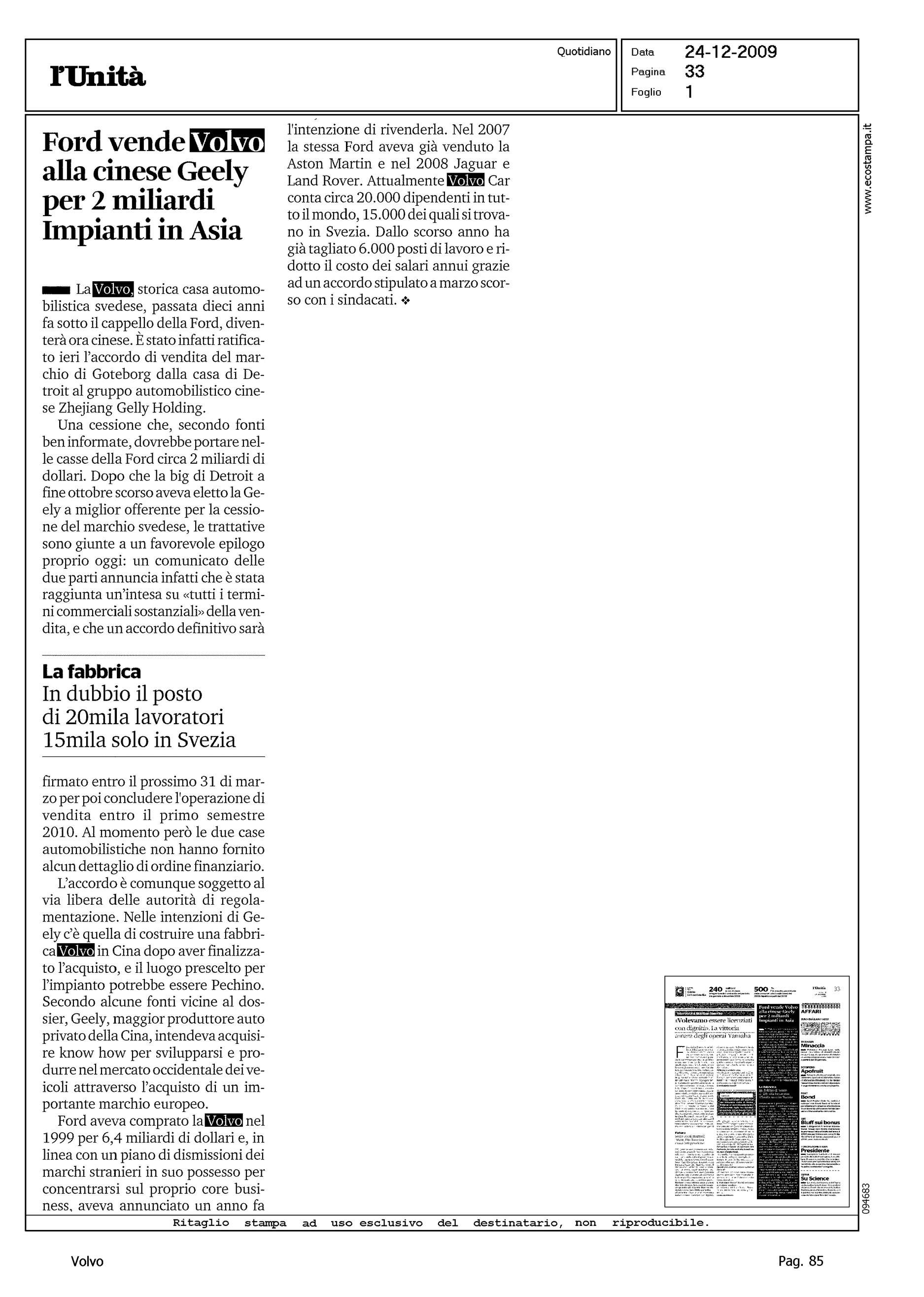 Author: Line: Corporate Model: Corporate Subject: - Title: FORD VENDE VOLVO ALLA CINESE GEELY PER 2 MILIARDI - IMPIANTI IN ASIAHighlight: VENDITA VOLVO ALLA GEELY