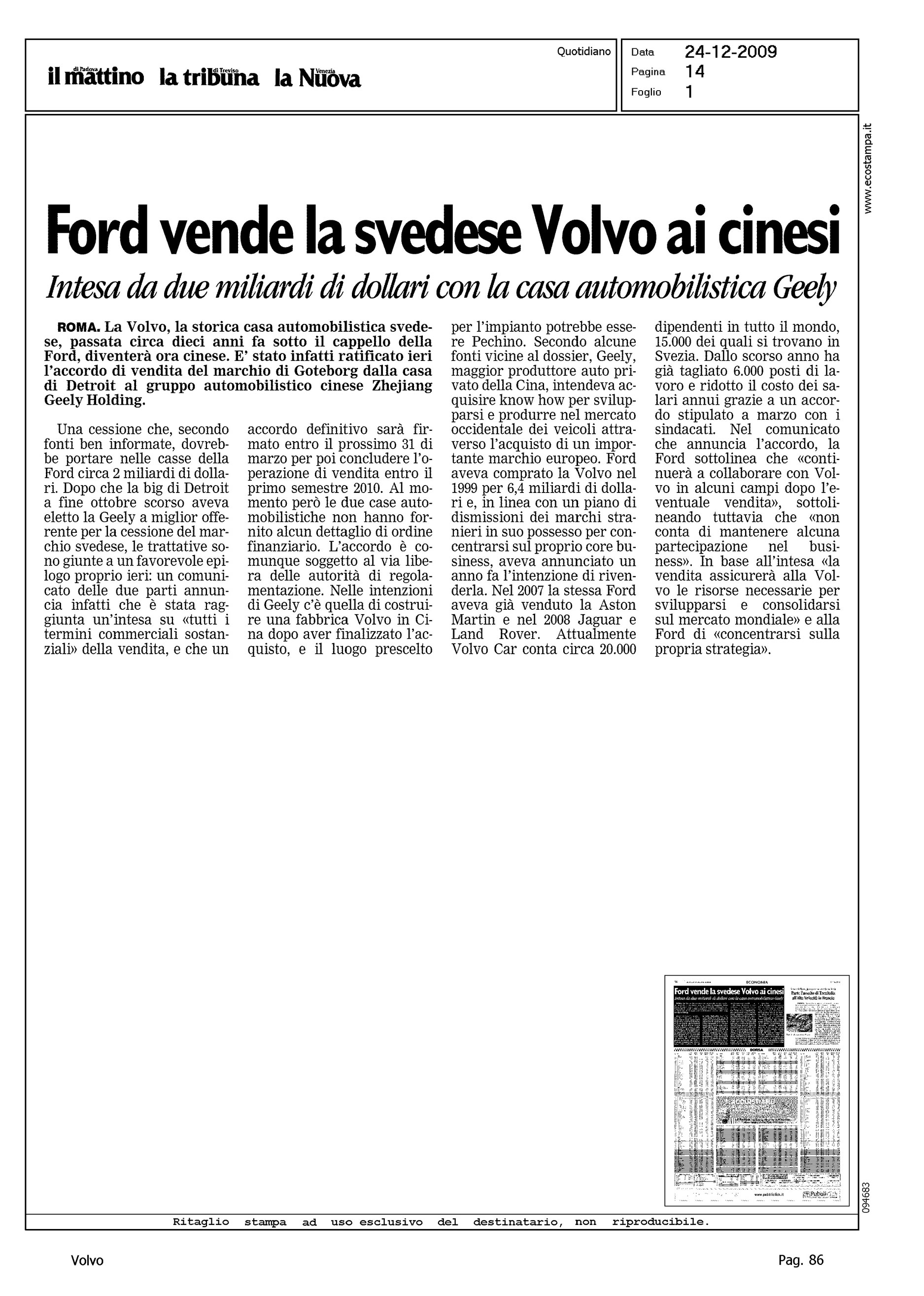 Author: Line: Corporate Model: Corporate Subject: - Title: FORD VENDE LA SVEDESE VOLVO AI CINESIHighlight: VENDITA VOLVO ALLA GEELY