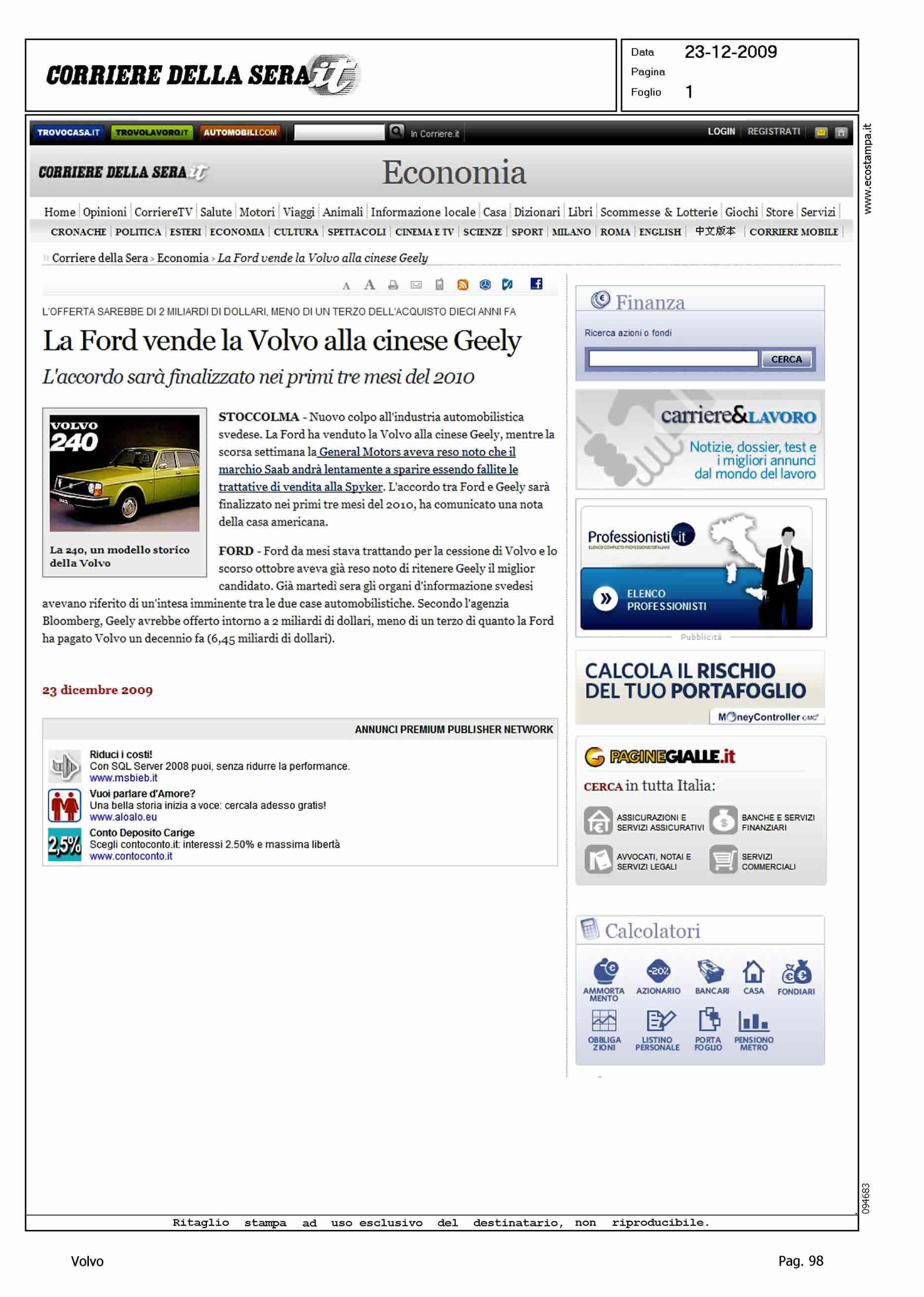 Author: Line: Corporate Model: Corporate Subject: - Title: LA FORD VENDE LA VOLVO ALLA CINESE GEELYHighlight: VENDITA VOLVO ALLA GEELY
