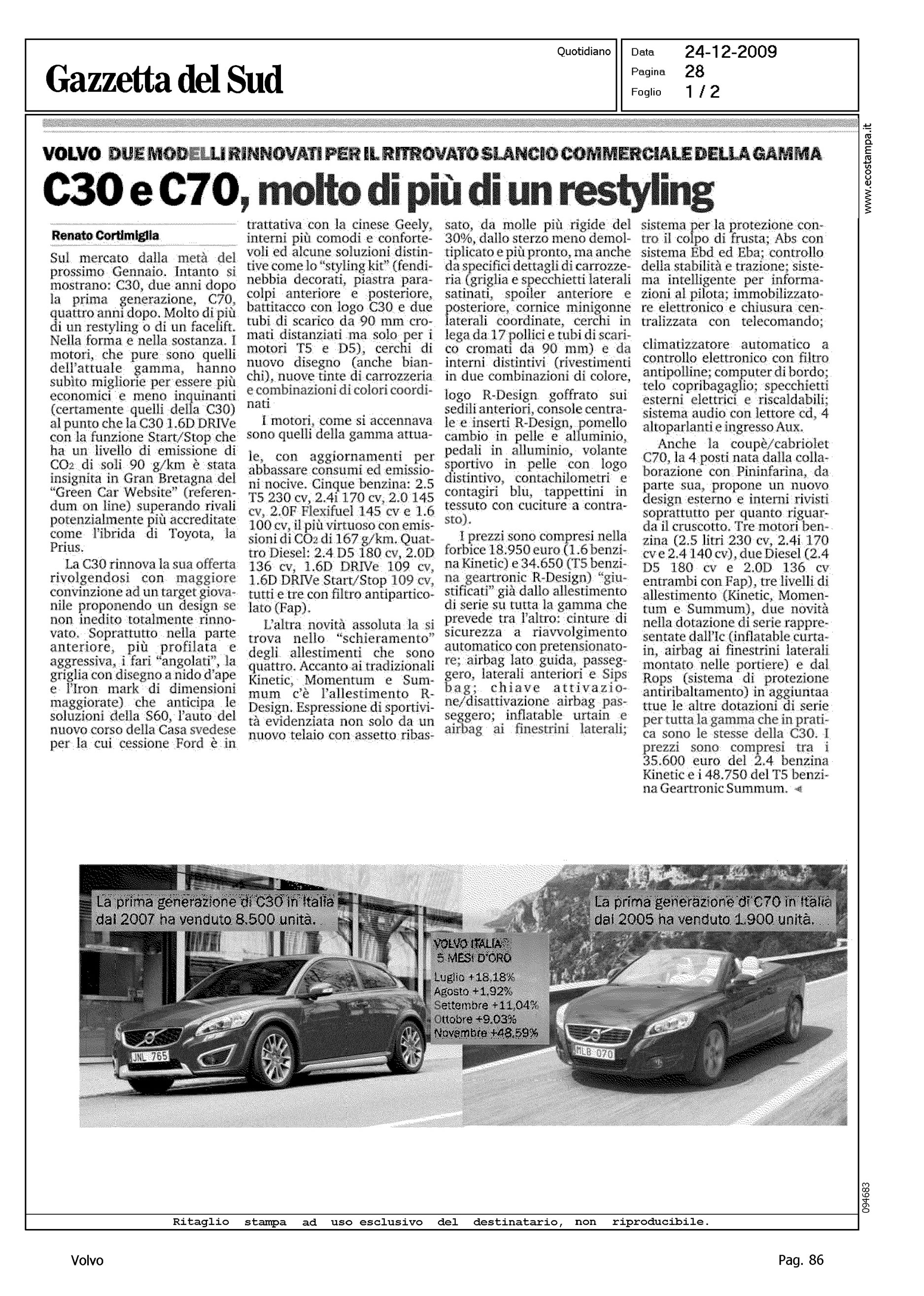 Author: CORTIMIGLIA, RENATOLine: Corporate Model: Volvo C30 Subject: - Title: C30 E C70, MOLTO DI PIU' DI UN RESTYLINGHighlight: EMISSIONI - CONSUMI - DESIGN - MOTORI - R DESIGN - PREZZI - SICUREZZA - ALLESTIMENTI