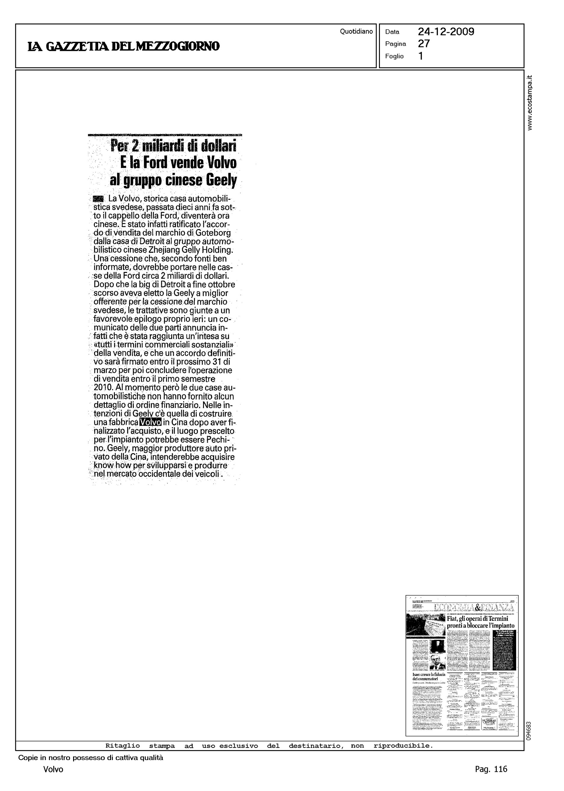 Author: Line: Corporate Model: Corporate Subject: - Title: PER 2 MILIARDI DI DOLLARI - E LA FORD VENDE VOLVO AL GRUPPO CINESE GEELYHighlight: VENDITA VOLVO ALLA GEELY