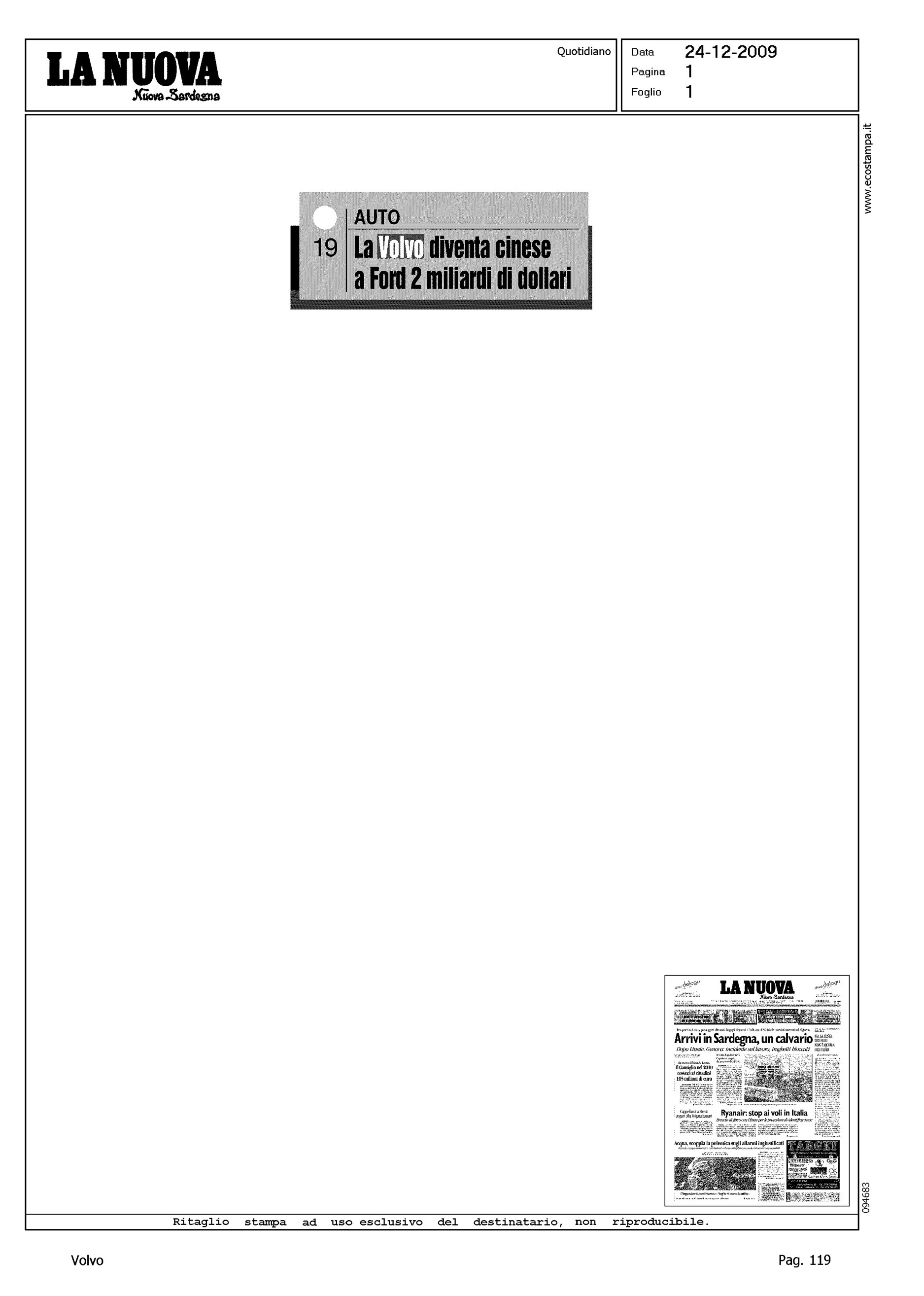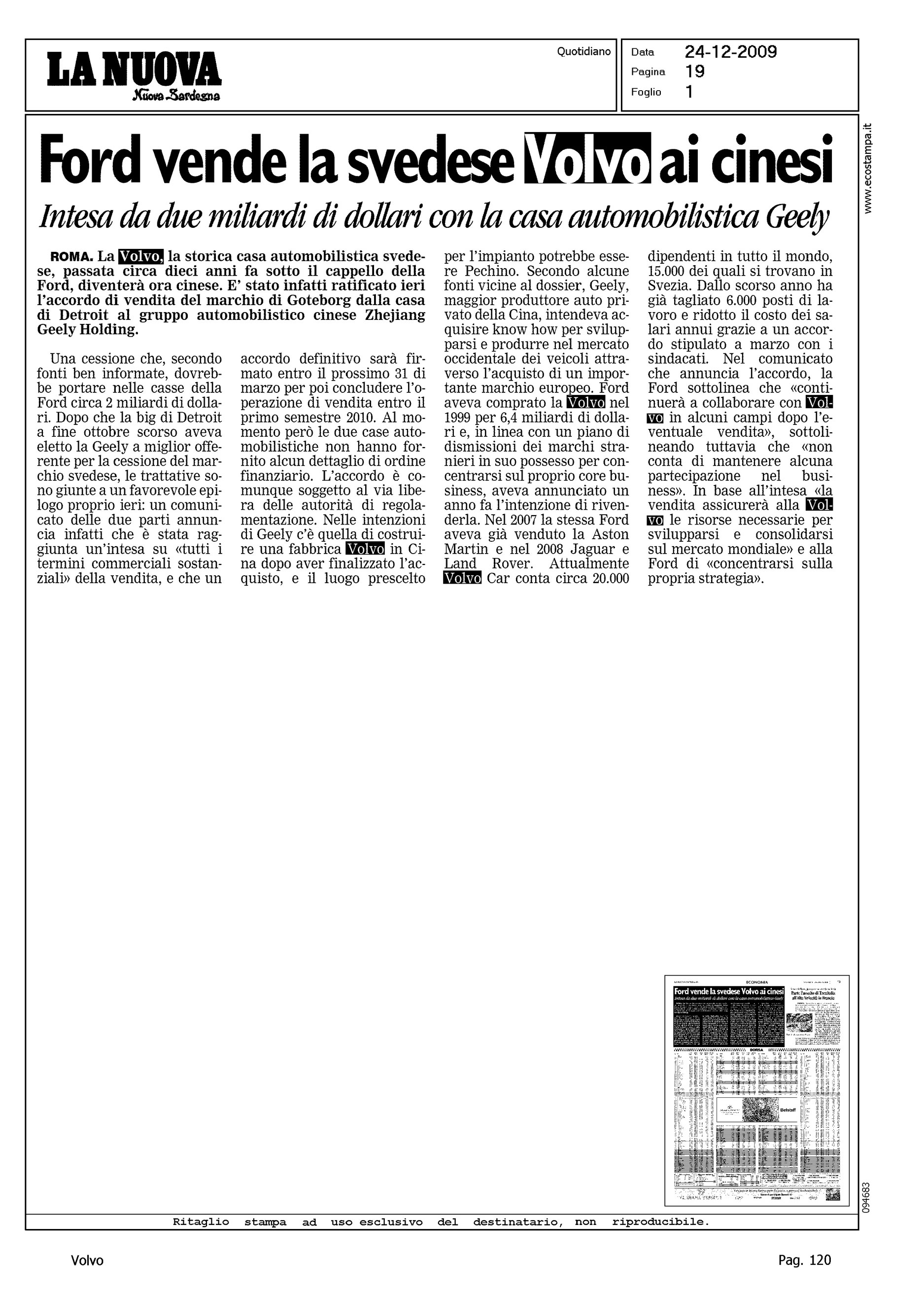 Author: Line: Corporate Model: Corporate Subject: - Title: FORD VENDE LA SVEDESE VOLVO AI CINESIHighlight: VENDITA VOLVO ALLA GEELY