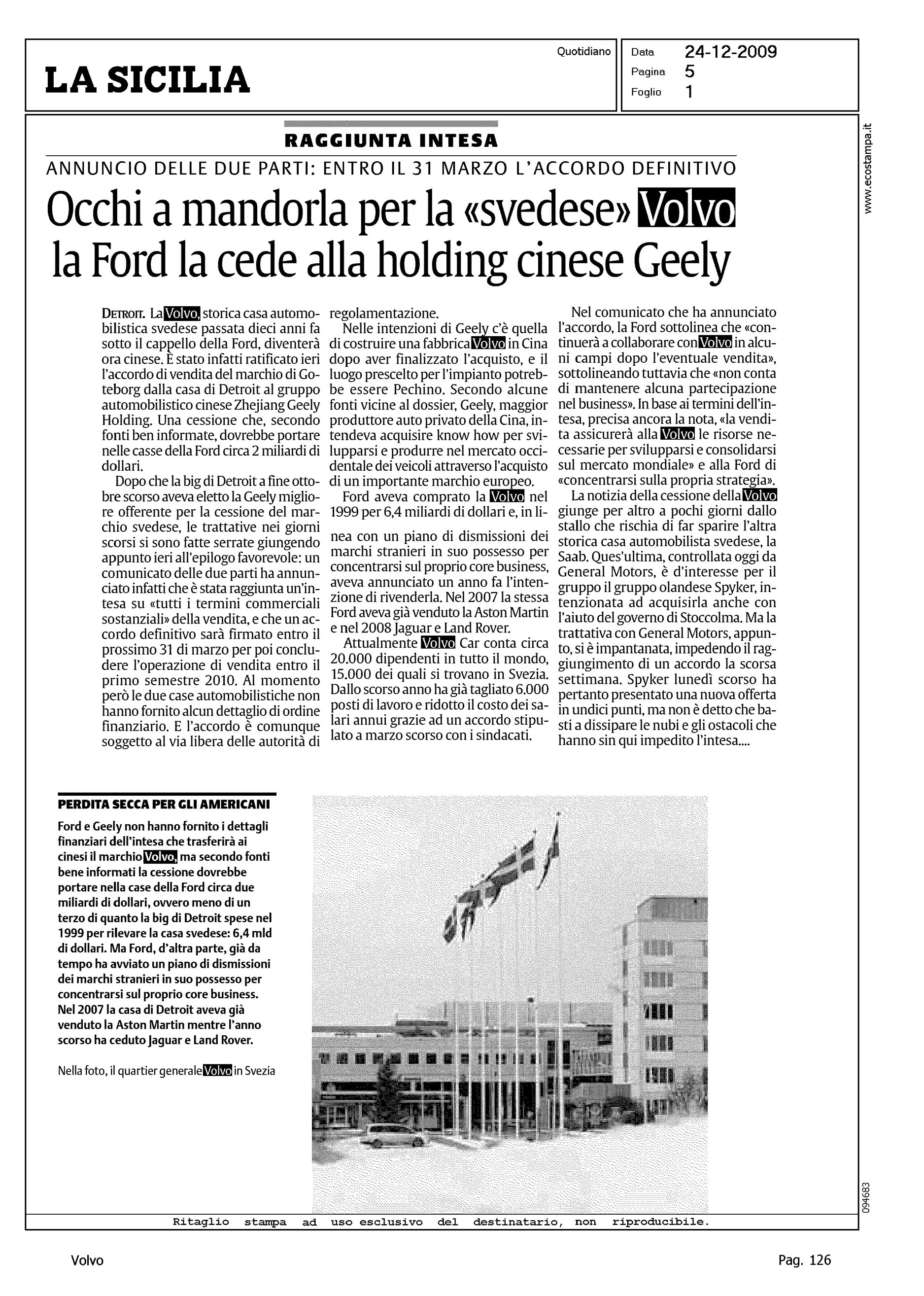 Author: Line: Corporate Model: Corporate Subject: - Title: OCCHI A MANDORLA PER LA "SVEDESE" VOLVO - LA FORD LA CEDE ALLA HOLDING CINESE GEELYHighlight: VENDITA VOLVO ALLA GEELY
