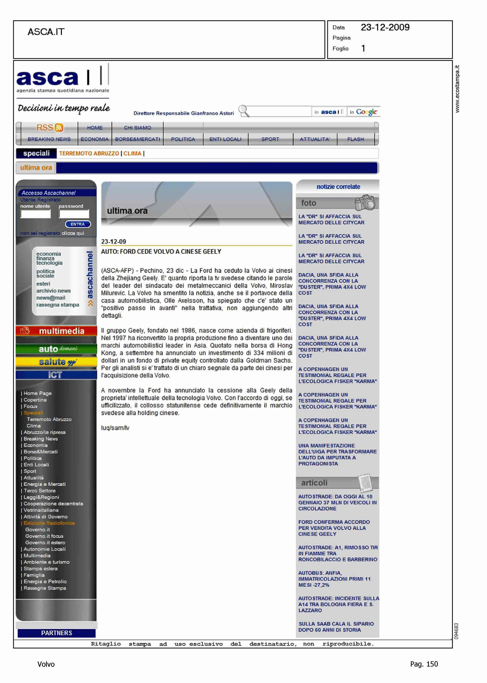 Author: Line: Corporate Model: Corporate Subject: - Title: AUTO: FORD CEDE VOLVO A CINESE GEELYHighlight: VENDITA VOLVO ALLA GEELY