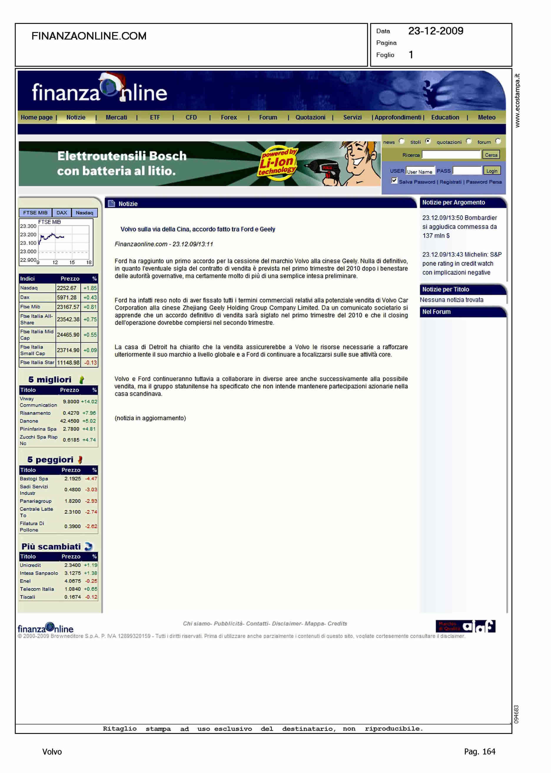 Author: Line: Corporate Model: Corporate Subject: - Title: VOLVO SULLA VIA DELLA CINA, ACCORDO FATTO TRA FORD E GEELYHighlight: VENDITA VOLVO ALLA GEELY