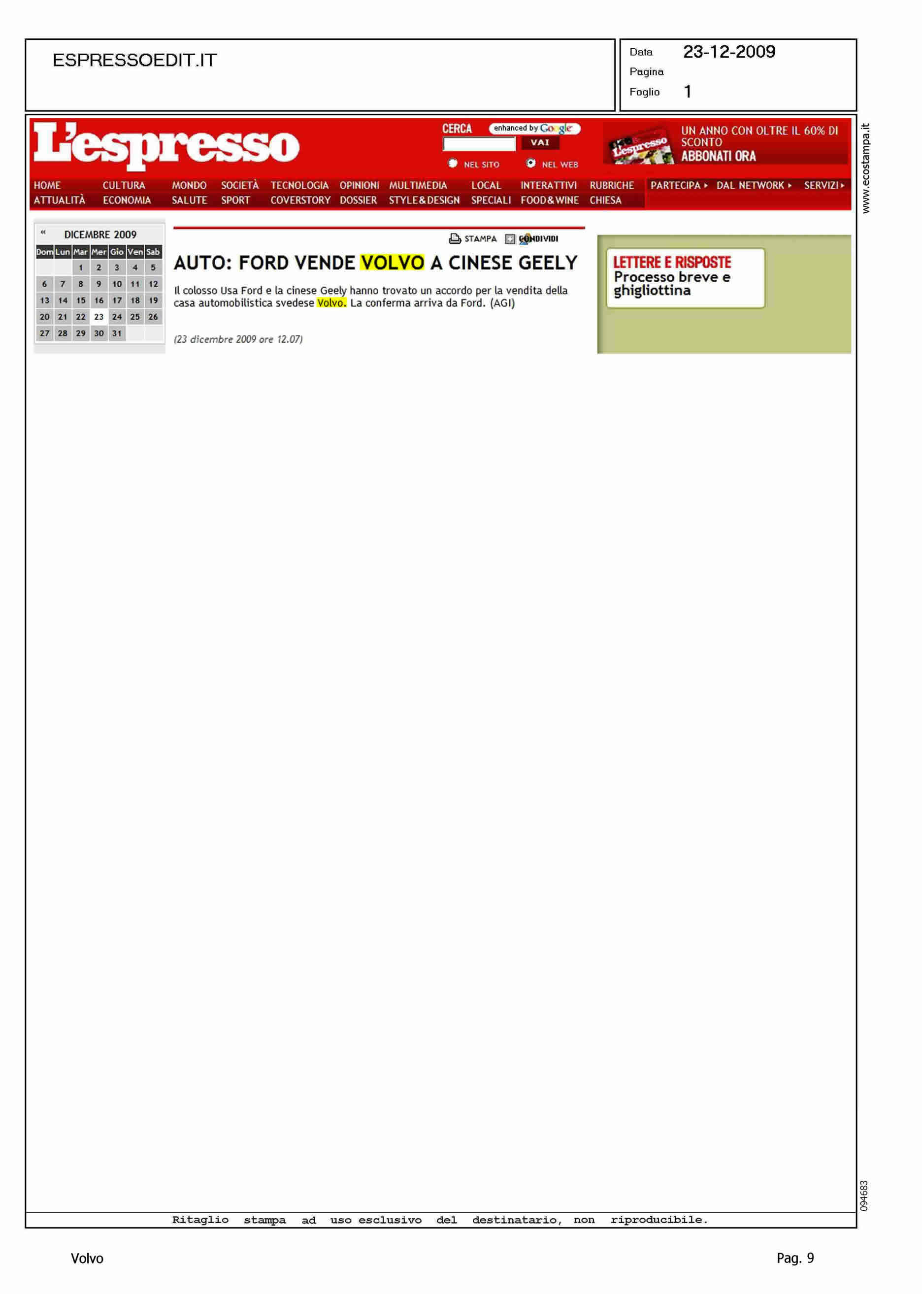 Author: Line: Corporate Model: Corporate Subject: - Title: AUTO: FORD VENDE VOLVO A CINESE GEELYHighlight: VENDITA VOLVO ALLA GEELY