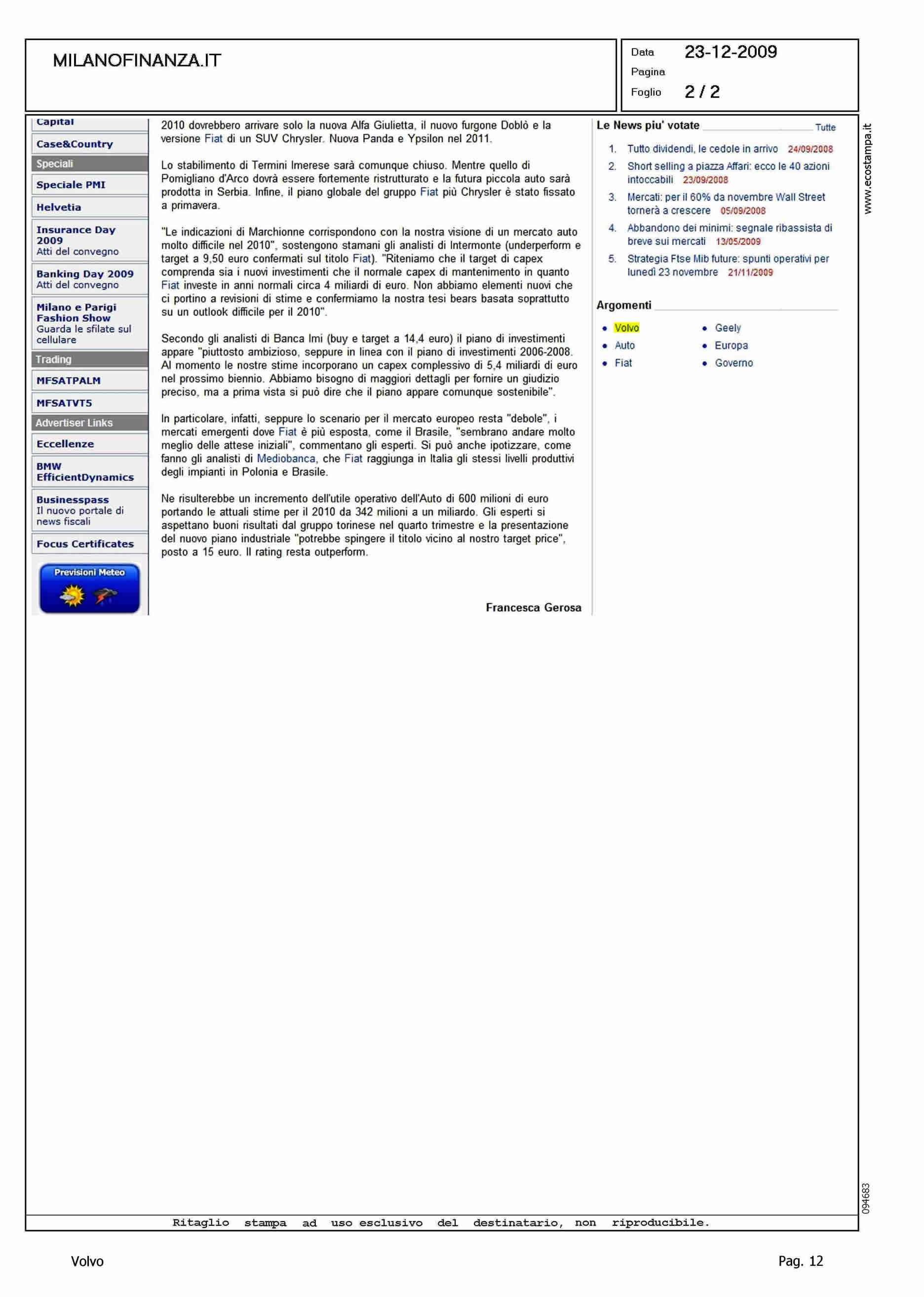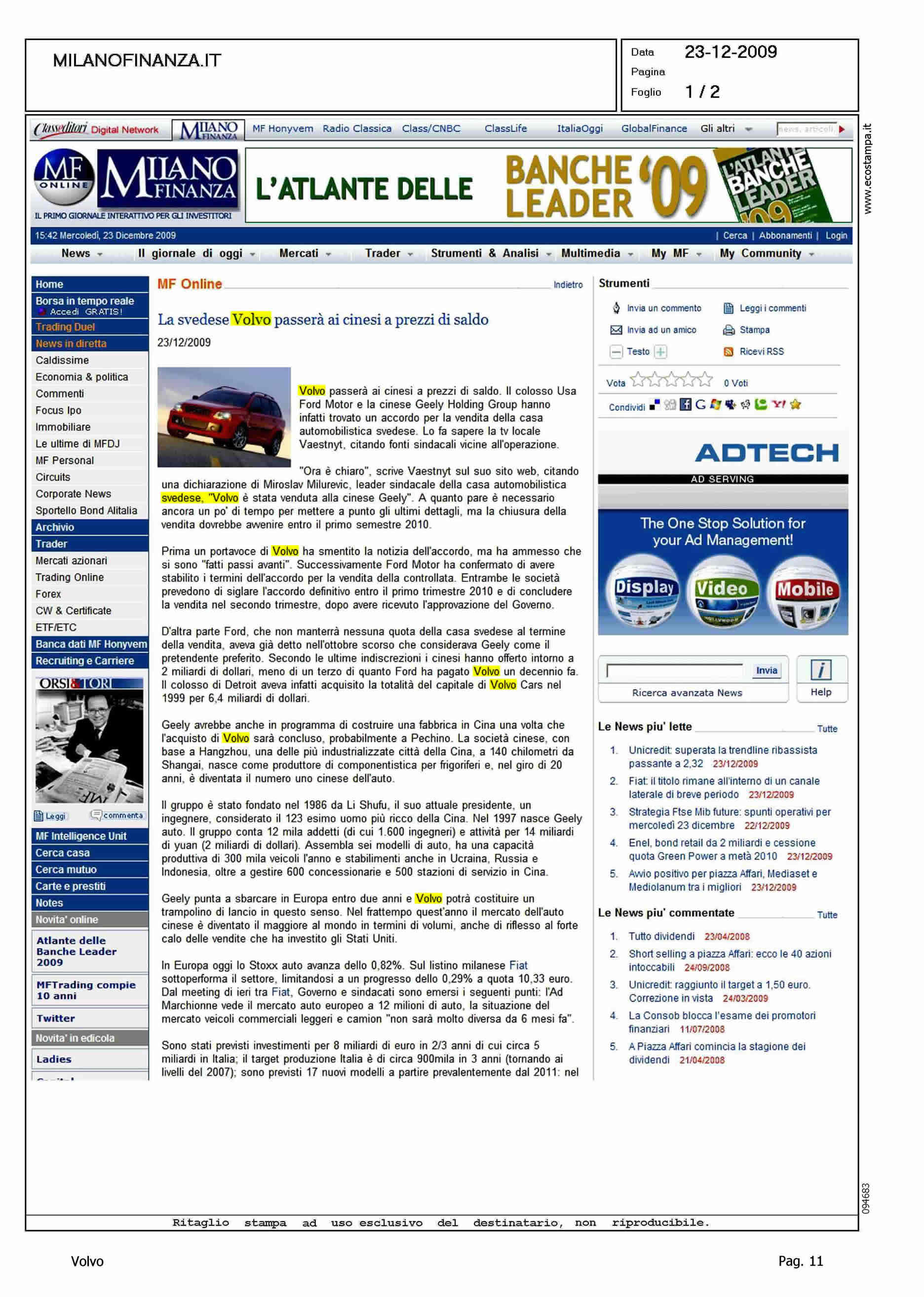 Author: GEROSA, FRANCESCALine: Corporate Model: Corporate Subject: - Title: LA SVEDESE VOLVO PASSERA' AI CINESI A PREZZO DI SALDOHighlight: VENDITA VOLVO ALLA GEELY