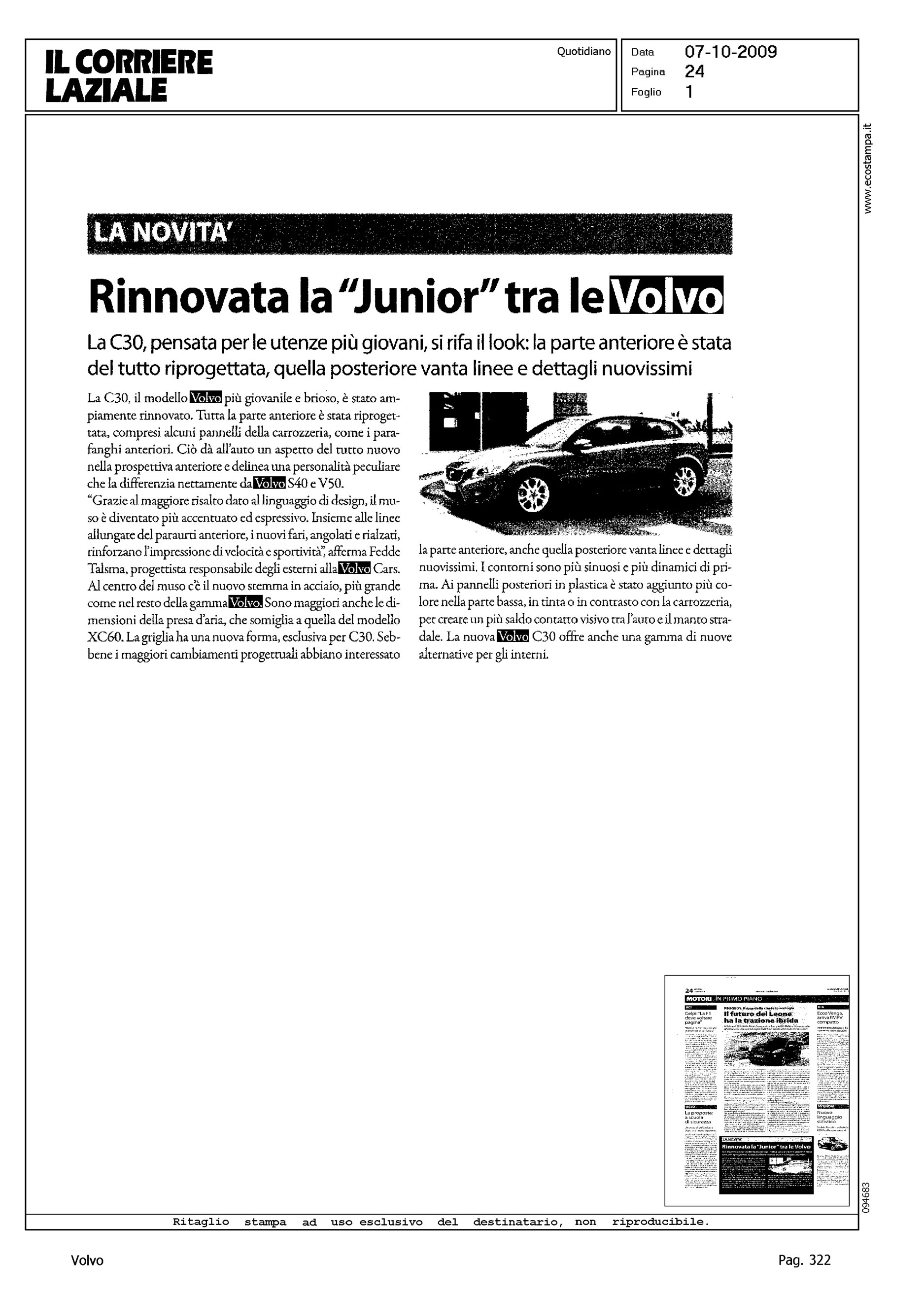 Author: Line: Corporate Model: Volvo C30 Subject: - Title: LA NOVITA' - RINNOVATA LA "JUNIOR" TRA LE VOLVOHighlight: ANTICIPAZIONE