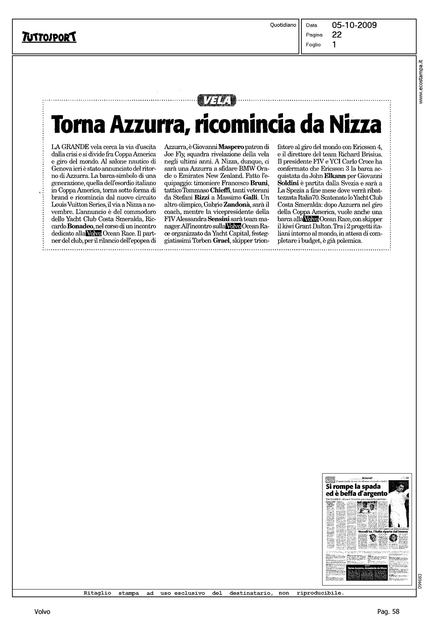 Author: Line: Corporate Model: Corporate Subject: Volvo Ocean Race Title: TORNA AZZURRA, RICOMINCIA DA NIZZAHighlight: YCCS