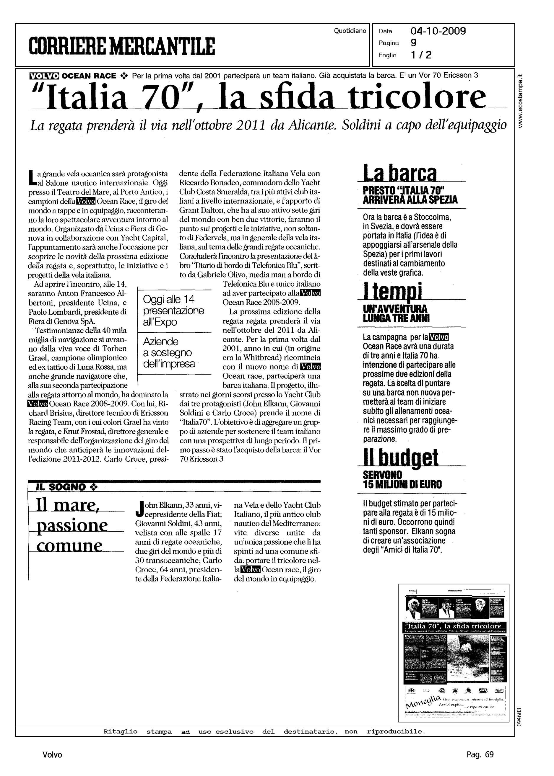 Author: Line: Corporate Model: Corporate Subject: Volvo Ocean Race Title: "ITALIA 70", LA SFIDA TRICOLOREHighlight: YCCS
