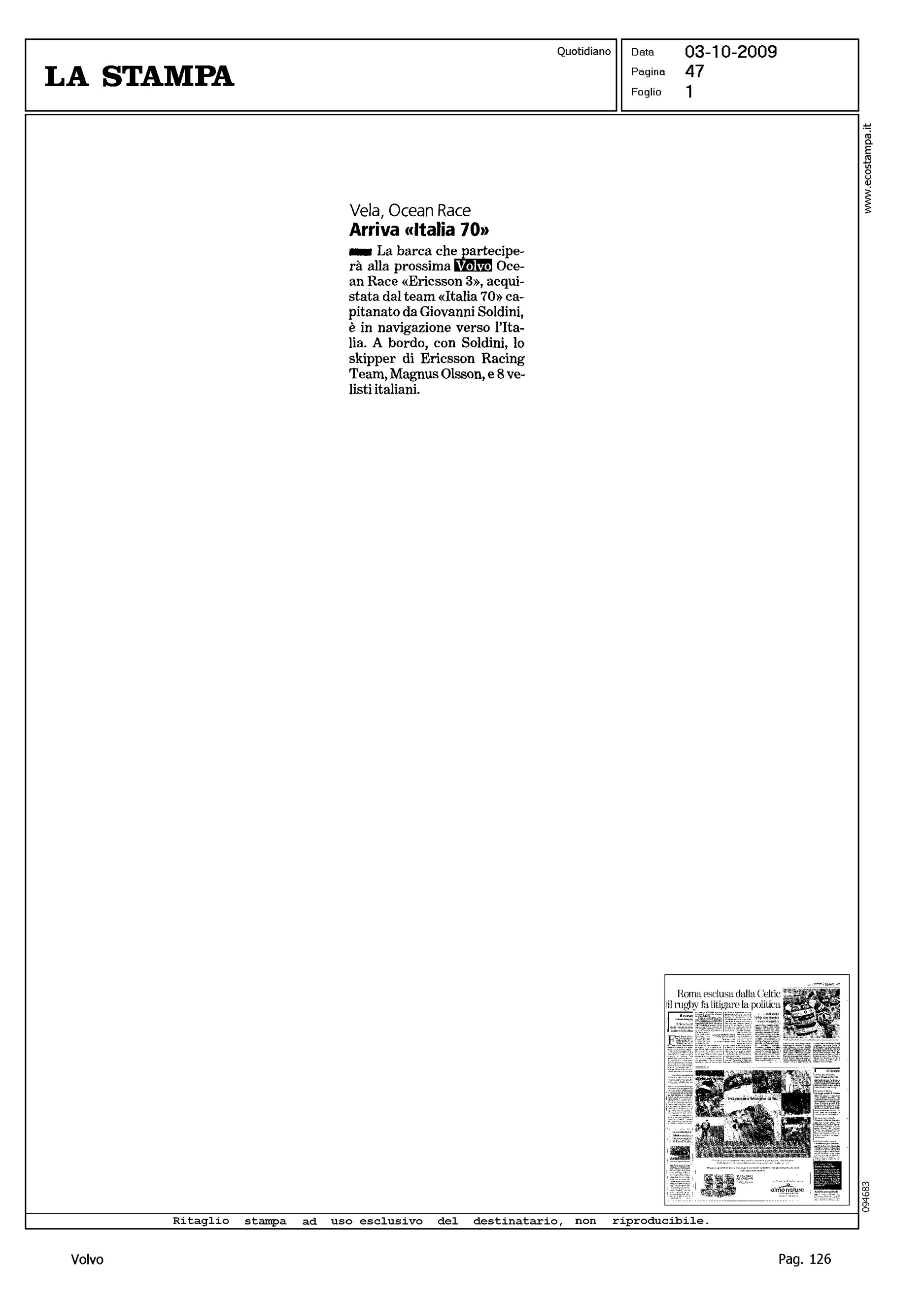 Author: Line: Corporate Model: Corporate Subject: Volvo Ocean Race Title: VELA, OCEAN RACE - ARRIVA "ITALIA 70"Highlight: ITALIA 70