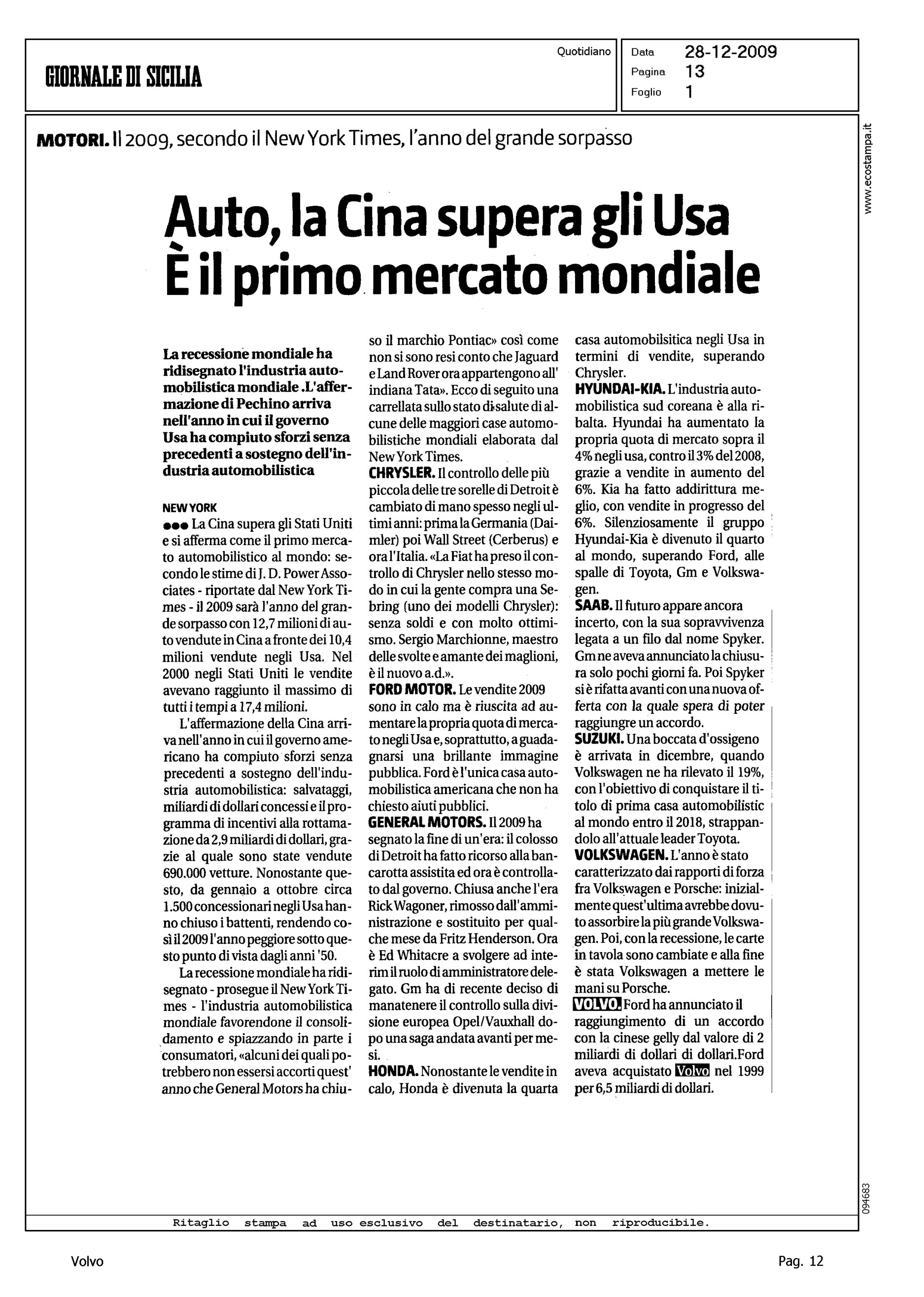 Author: Line: Corporate Model: Corporate Subject: - Title: AUTO, LA CINA SUPERA GLI USA - E' IL PRIMO MERCATO MONDIALEHighlight: VENDITA VOLVO ALLA GEELY