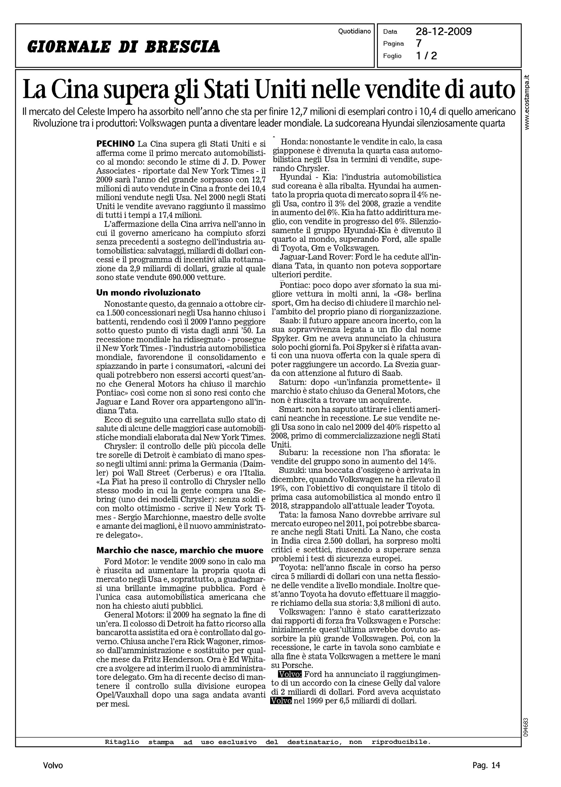 Author: Line: Corporate Model: Corporate Subject: - Title: LA CINA SUPERA GLI STATI UNITI NELLE VENDITE DI AUTOHighlight: VENDITA VOLVO ALLA GEELY