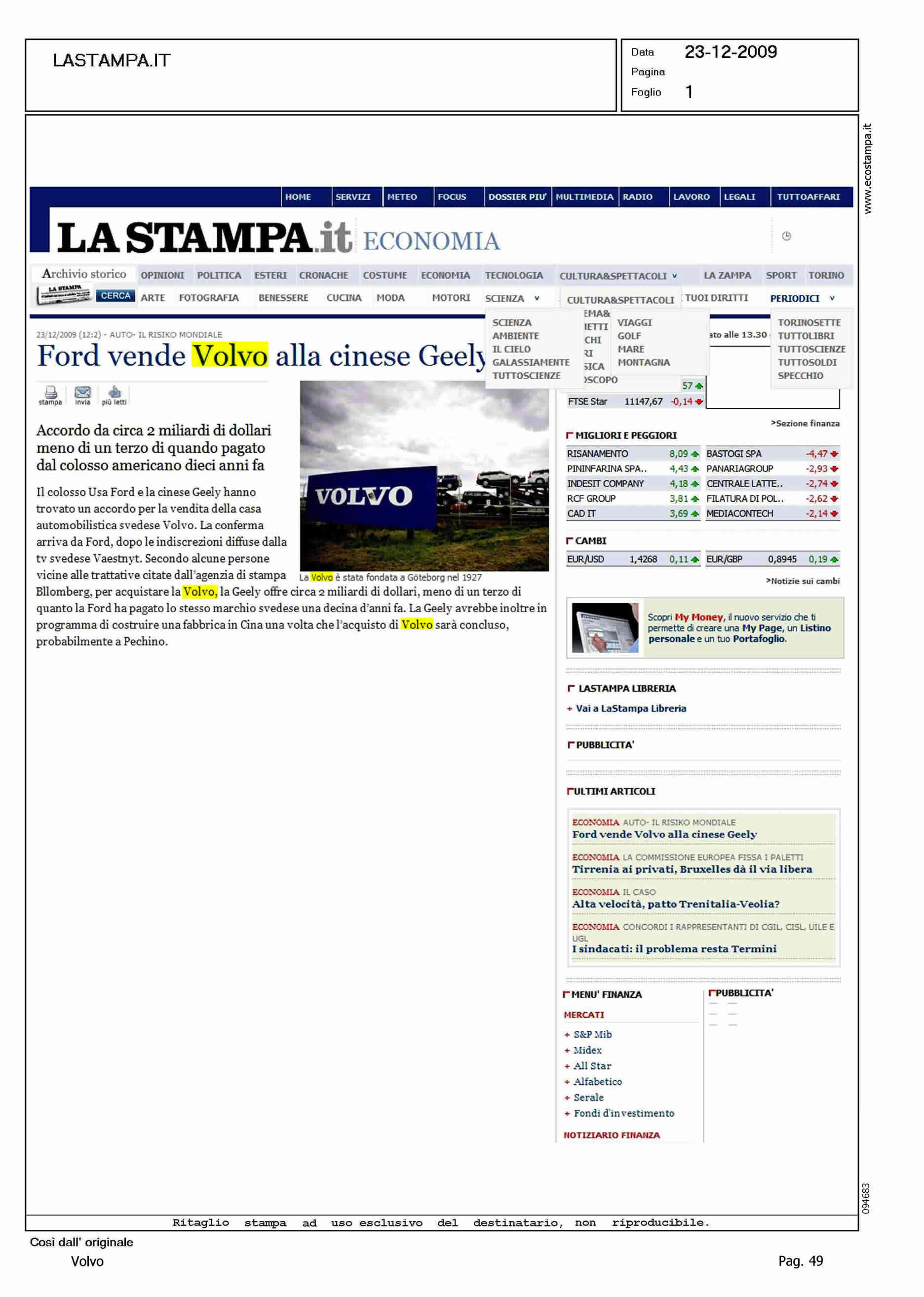 Author: Line: Corporate Model: Corporate Subject: - Title: FORD VENDE VOLVO ALLA CINESE GEELYHighlight: VENDITA VOLVO ALLA GEELY
