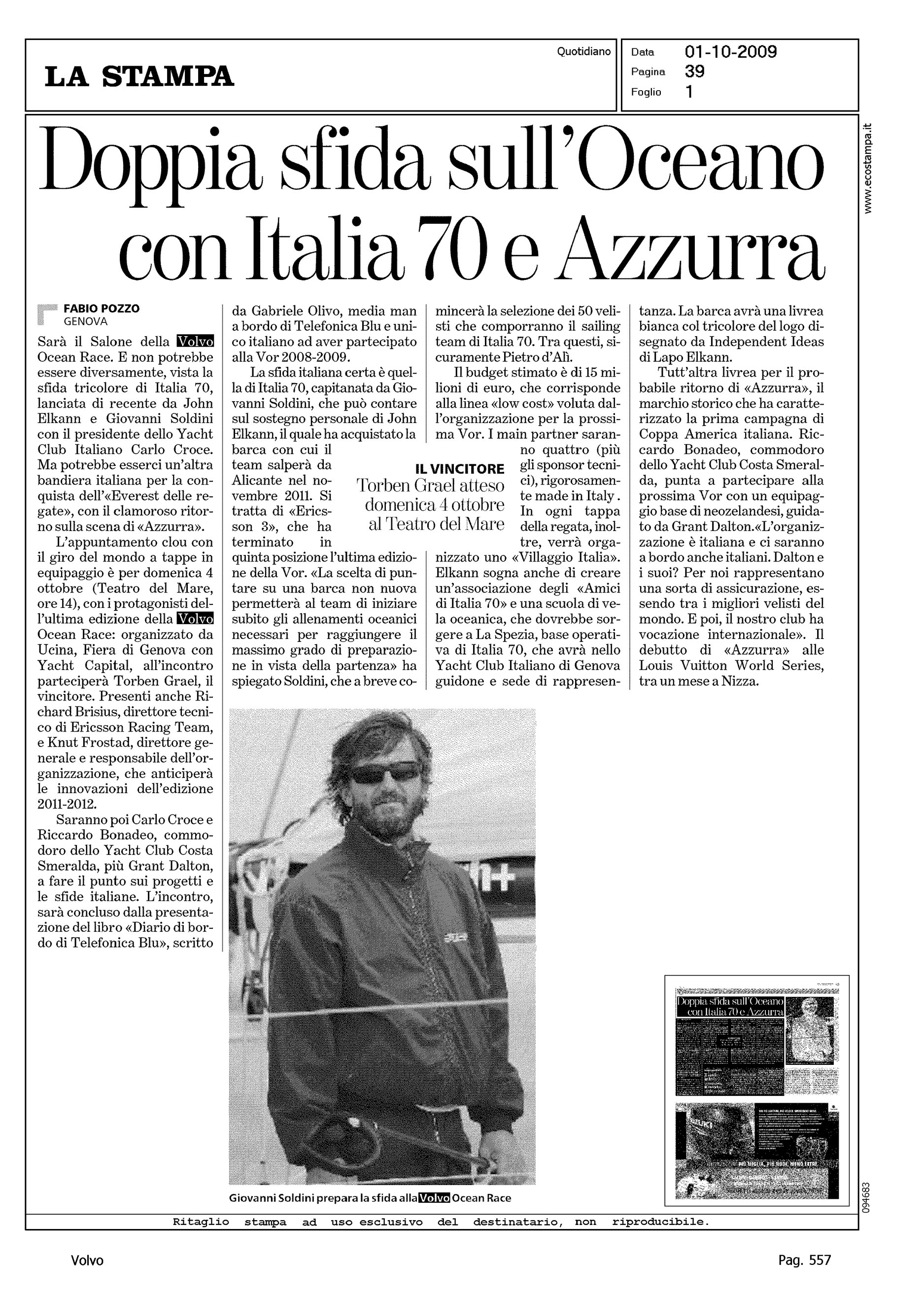 Author: POZZO, FABIOLine: Corporate Model: Corporate Subject: Volvo Ocean Race Title: DOPPIA SFIDA SULL'OCEANO CON ITALIA 70 E AZZURRAHighlight: ANTICIPO SU SALONE DI GENOVA - ATTESA PER GRAEL