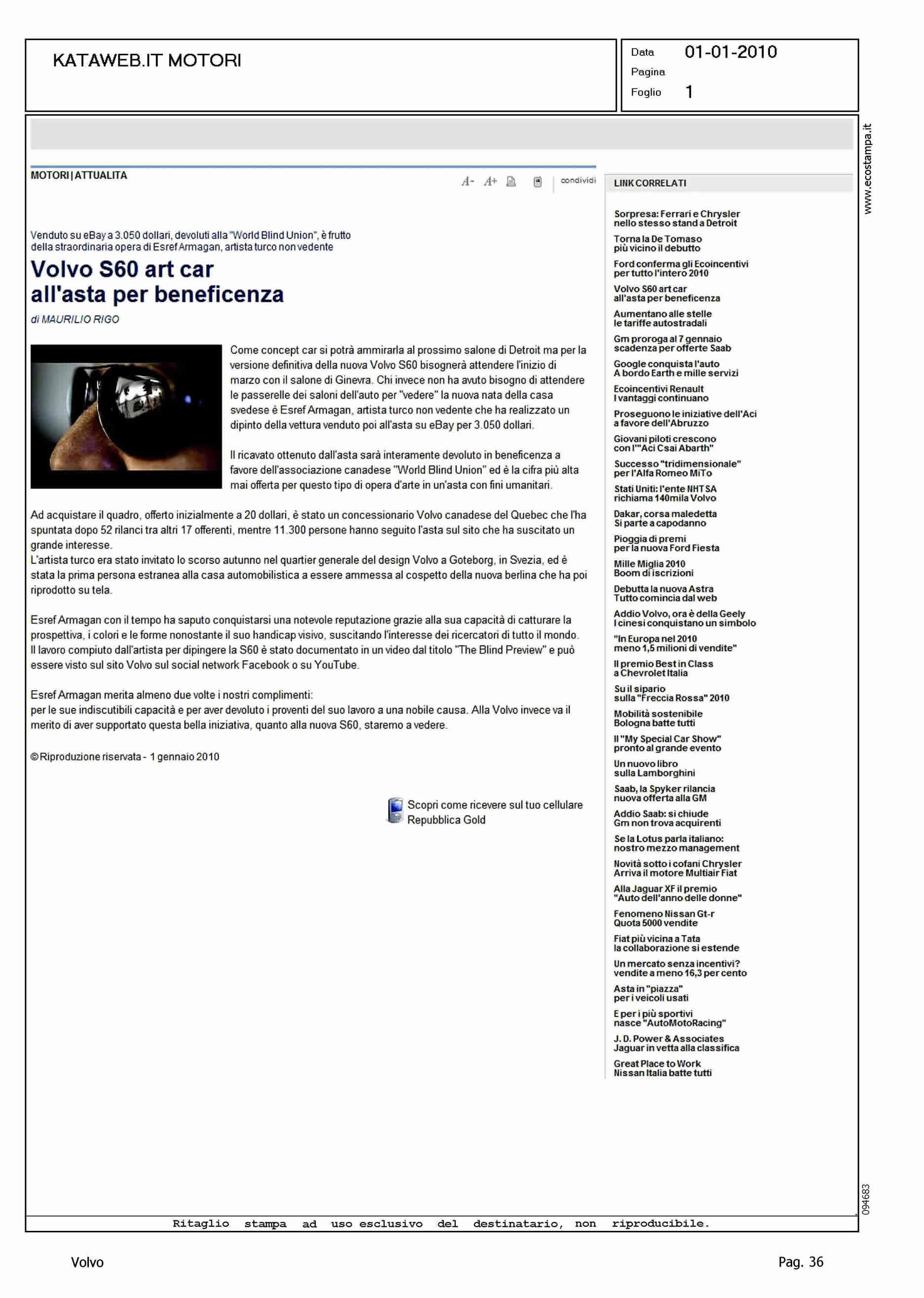 Author: RIGO, MAURILIOLine: S60 Model: Subject: - Title: VOLVO S60 ART CAR ALL'ASTA PER BENEFICIENZAHighlight: DETROIT - ASTA EBAY