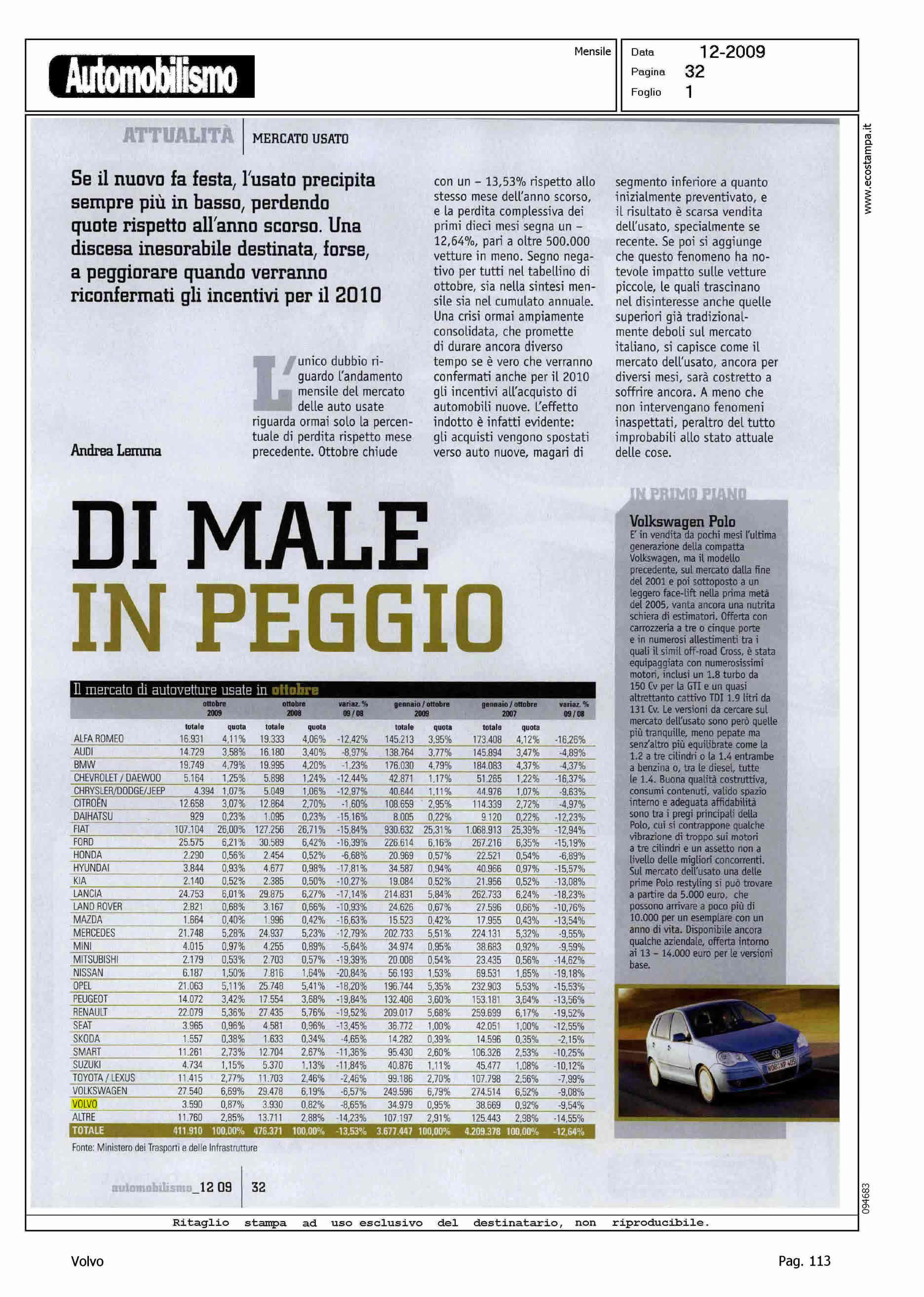 Author: LEMMA, ANDREALine: Corporate Model: Corporate Subject: - Title: DI MALE IN PEGGIOHighlight: TABELLA QUOTA VOLVO