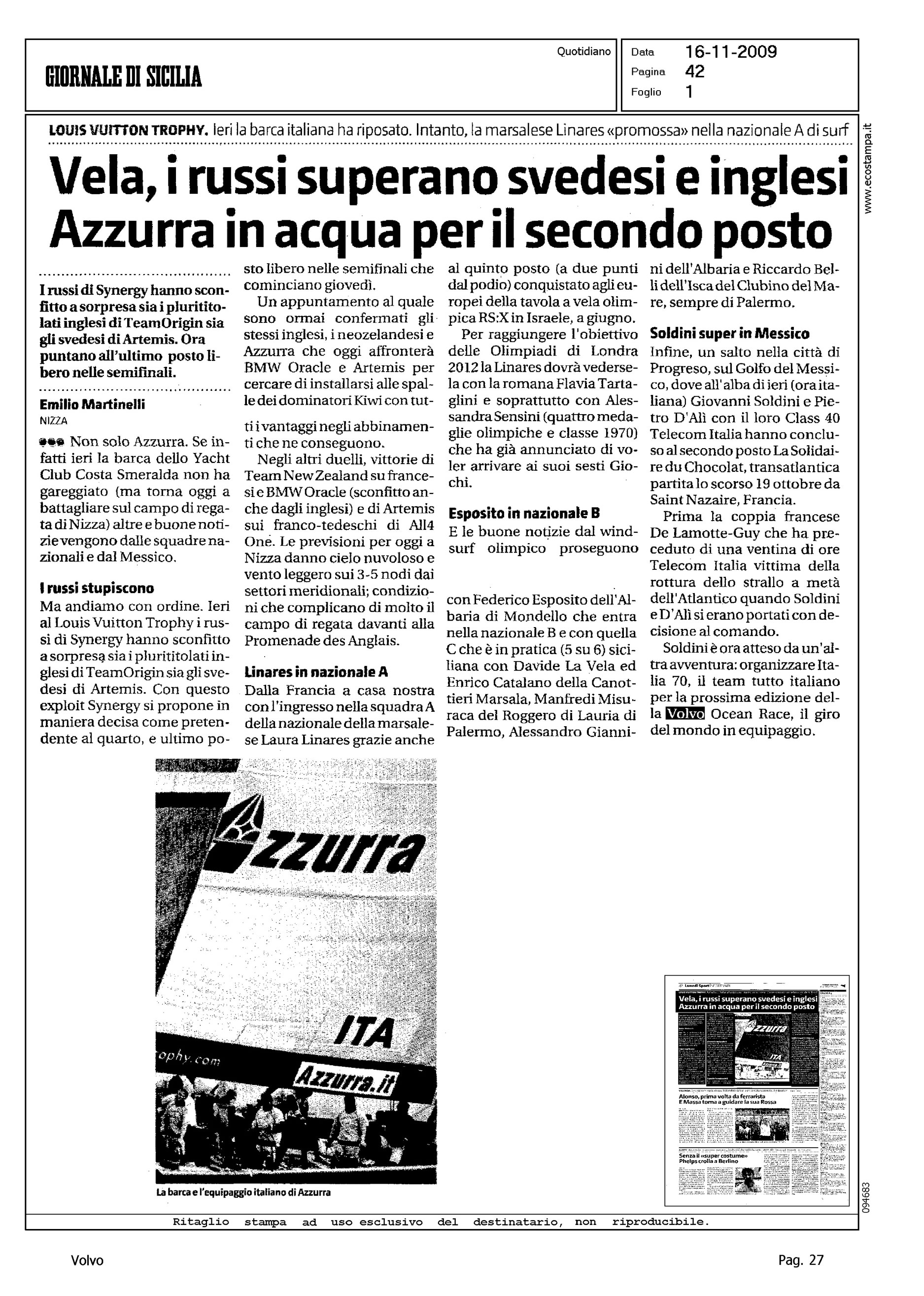 Author: MARTINELLI, EMILIOLine: Corporate Model: Corporate Subject: Volvo Ocean Race Title: VELA, I RUSSI SUPERANO SVEDESI E INGLESIHighlight: LV TROPHY CITAZIONE VOR