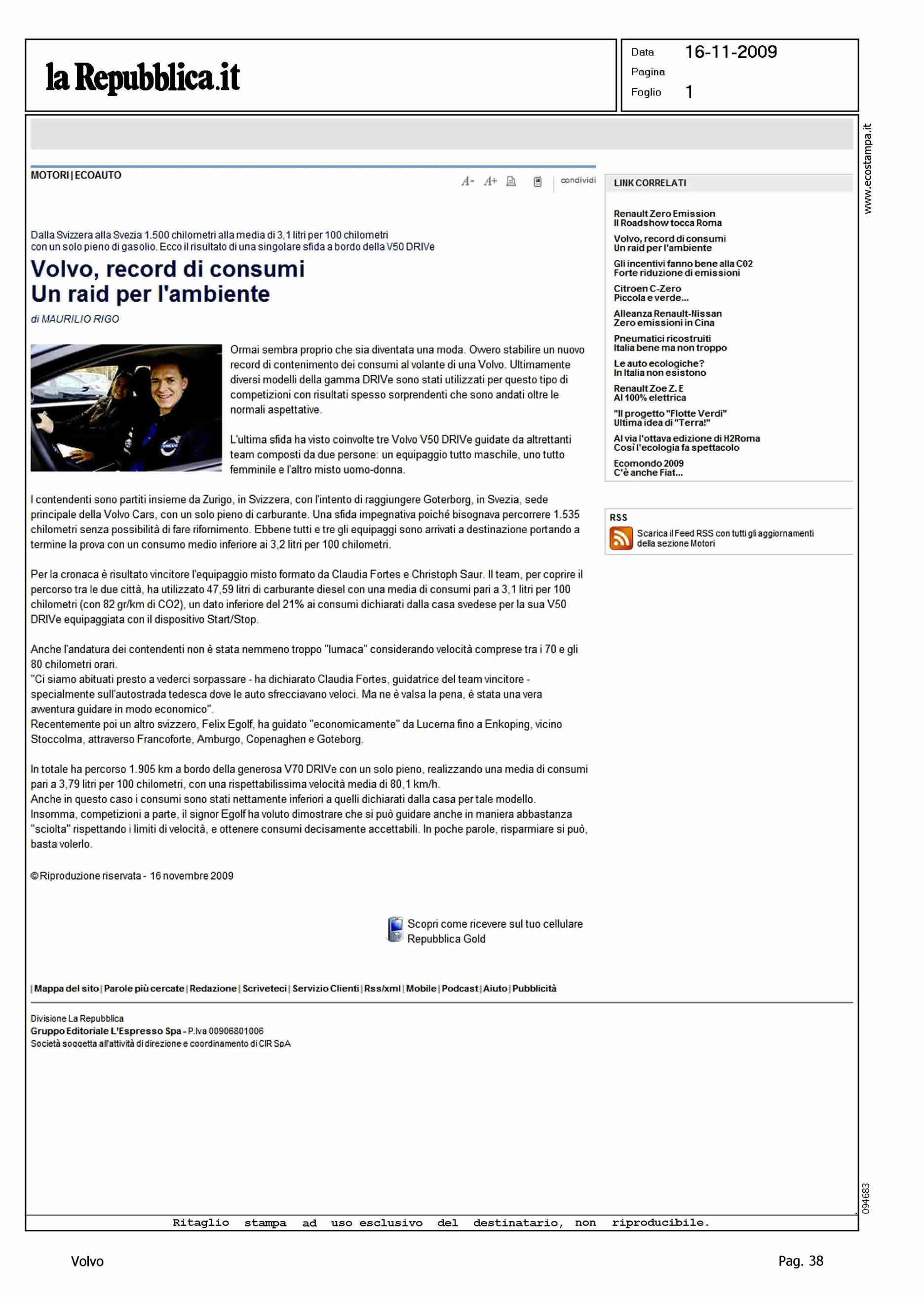 Author: RIGO, MAURILIOLine: Corporate Model: Corporate Subject: Line (Range) Drive Title: VOLVO, RECORD DI CONSUMI - UN RAID PER L'AMBIENTEHighlight: TEST ZURIGO - GOTEBORG