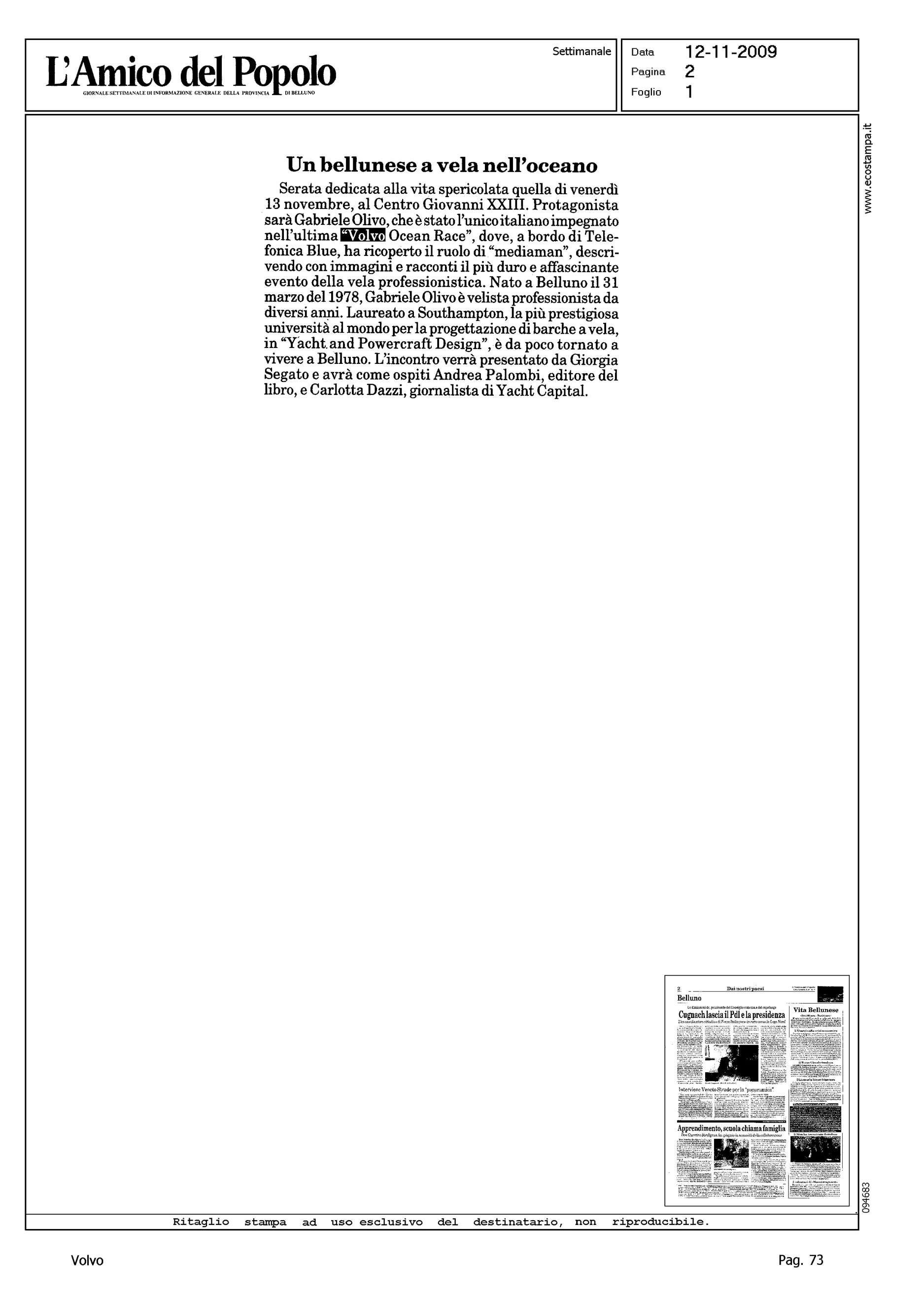 Author: Line: Corporate Model: Corporate Subject: Volvo Ocean Race Title: UN BELLUNESE A VELA NELL'OCEANOHighlight: TELEFONICA BLU