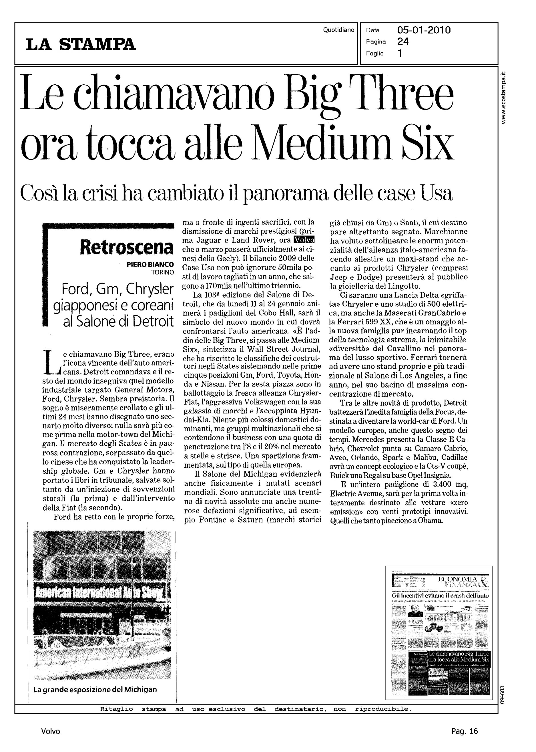 Author: BIANCO, PIEROLine: Corporate Model: Corporate Subject: - Title: LE CHIAMAVANO BIG THREE ORA TOCCA ALLE MEDIUM SIXHighlight: DETROIT - ANTICIPAZIONI - VENDITA VOLVO ALLA GEELY
