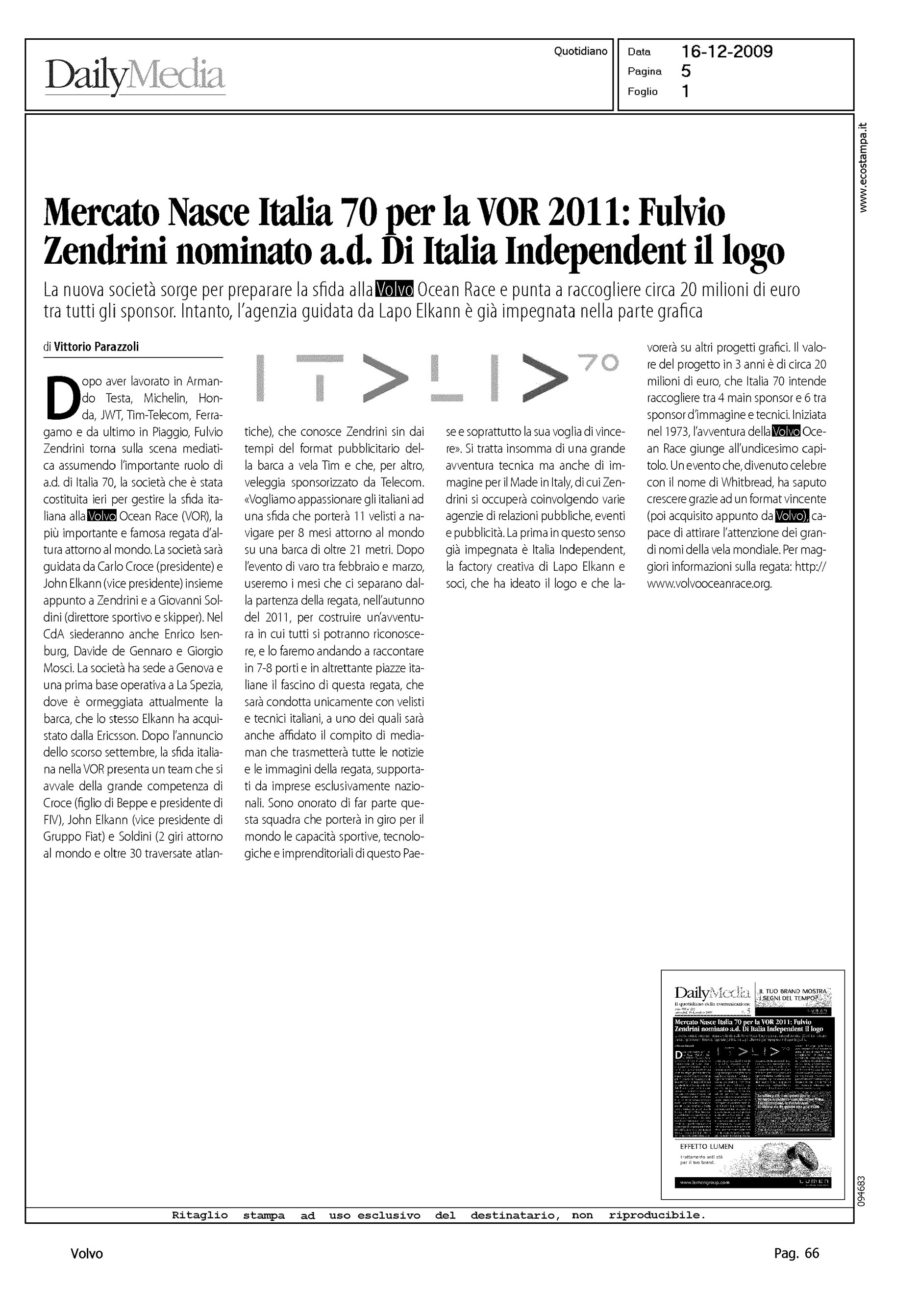 Author: PARAZZOLI, VITTORIOLine: Corporate Model: Corporate Subject: Volvo Ocean Race Title: NASCE ITALIA 70 PER LA VOR 2011:...Highlight: PARTECIPAZIONE ITALIA ALLA VOR