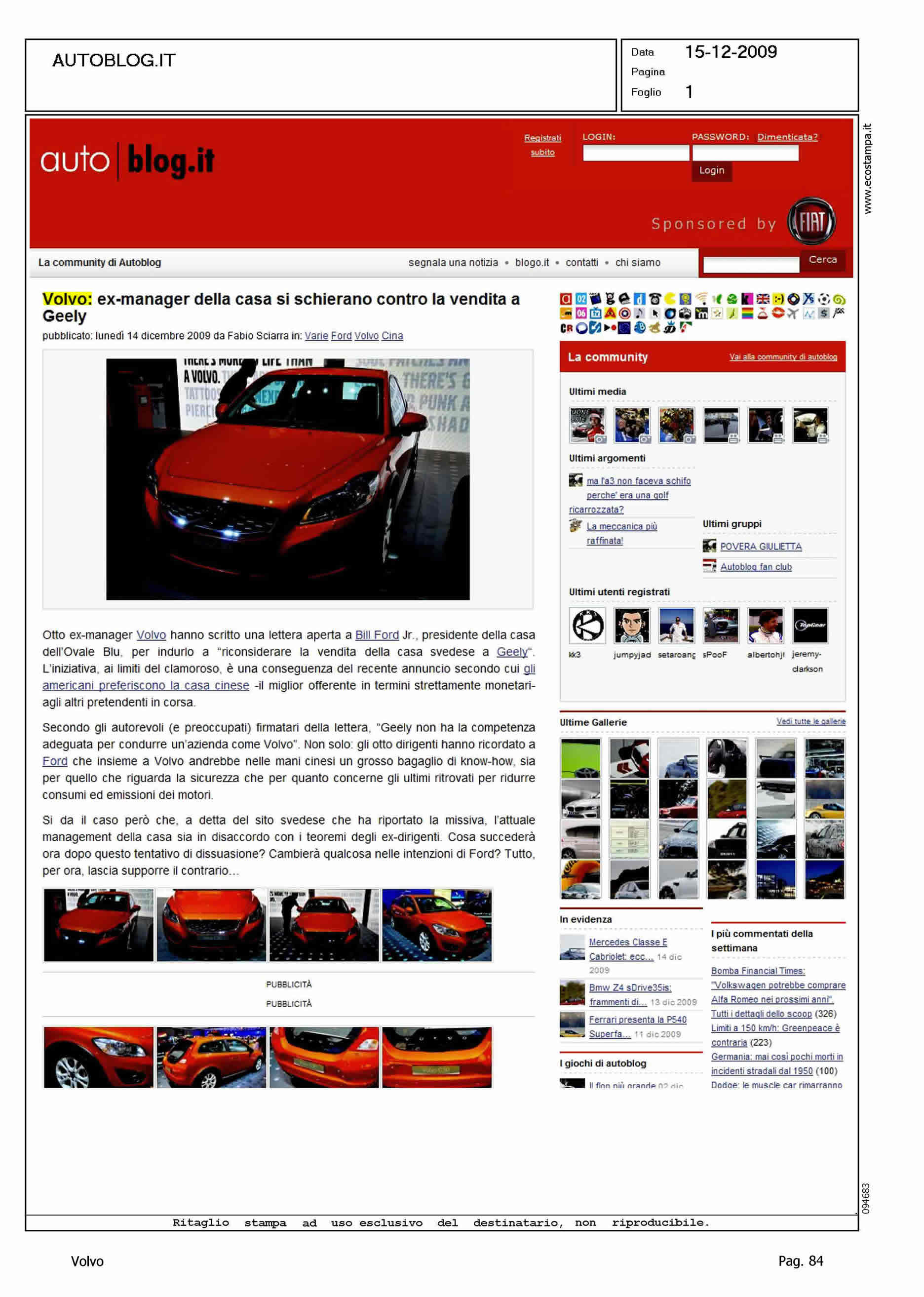 Author: Line: Corporate Model: Corporate Subject: - Title: VOLVO: EX-MANAGER DELLA CASA SI SCHIERANO CONTRO LA VENDITA A GEELYHighlight: VENDITA VOLVO ALLA GEELY