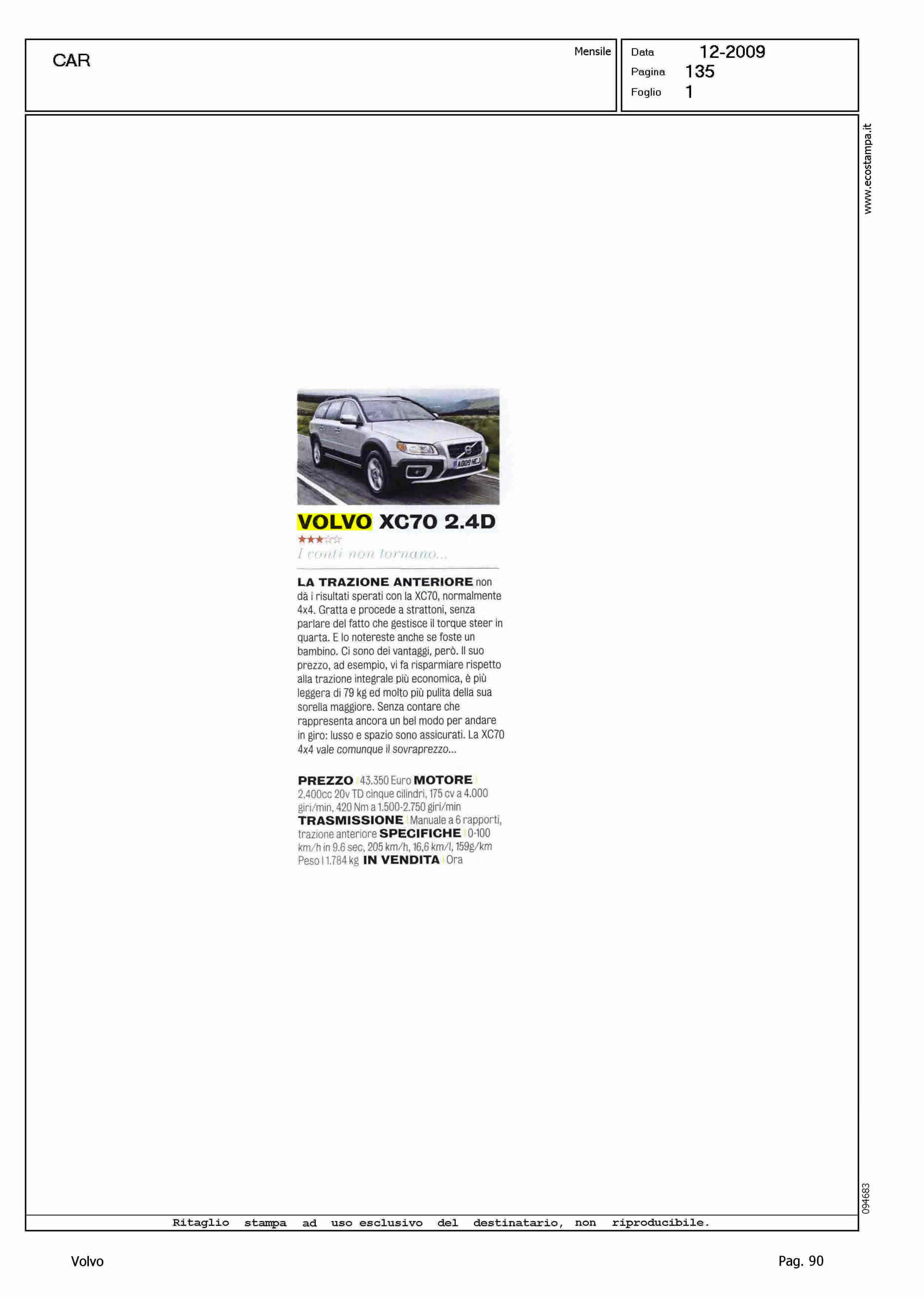 Author: Line: Corporate Model: Volvo XC70 Subject: - Title: VOLVO XC70 2.4DHighlight: SCHEDA - VALUTAZIONE 3/5 - DIFFICOLTA' CON LA TRAZIONE NON ALL'ALTEZZA - PREZZO VANTAGGIOSO - L'AUTO VALE IL SUO PREZZO