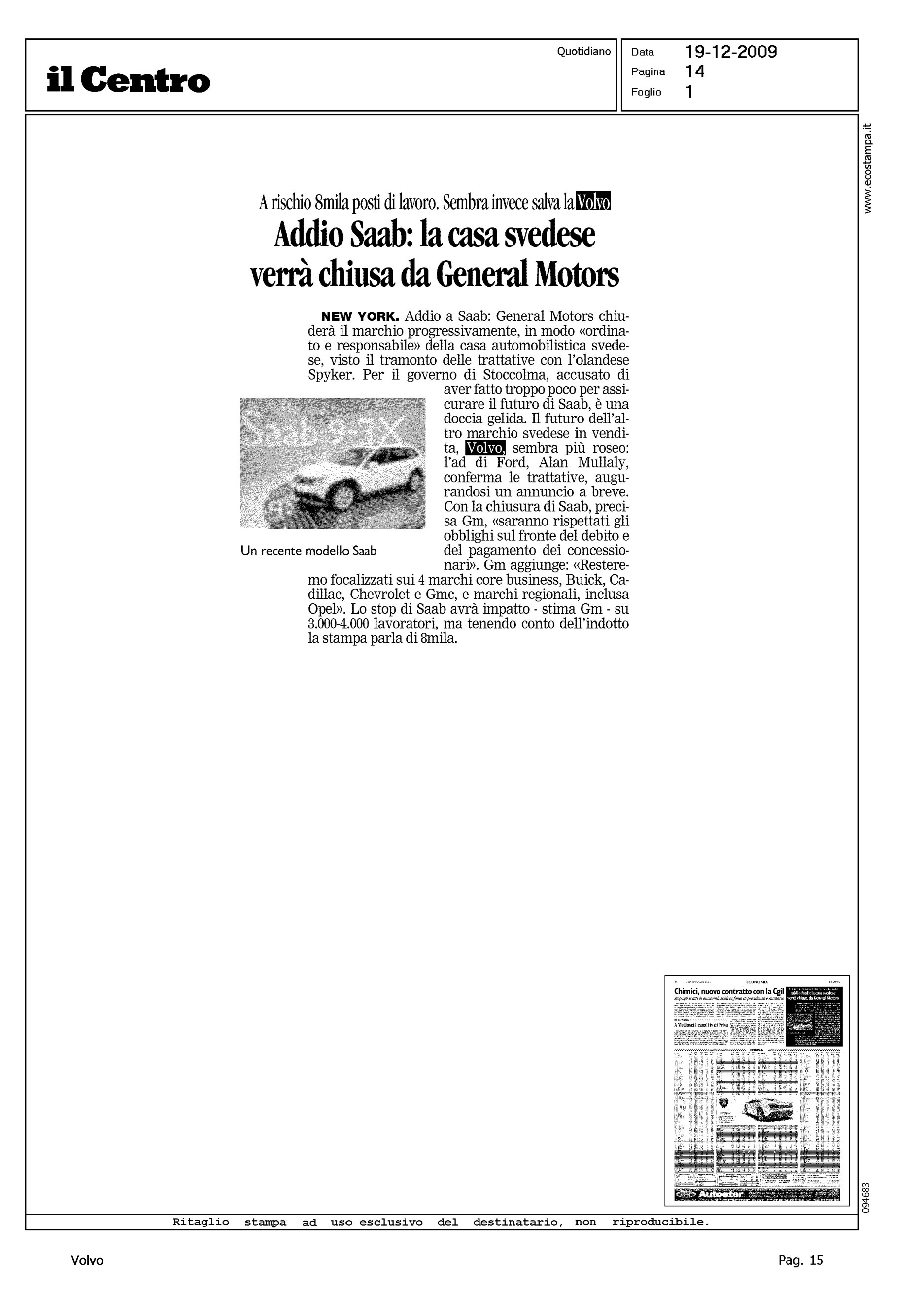Author: Line: Corporate Model: Corporate Subject: - Title: ADDIO SAAB:... SEMBRA INVECE SALVA LA VOLVOHighlight: VENDITA VOLVO ALLA GEELY