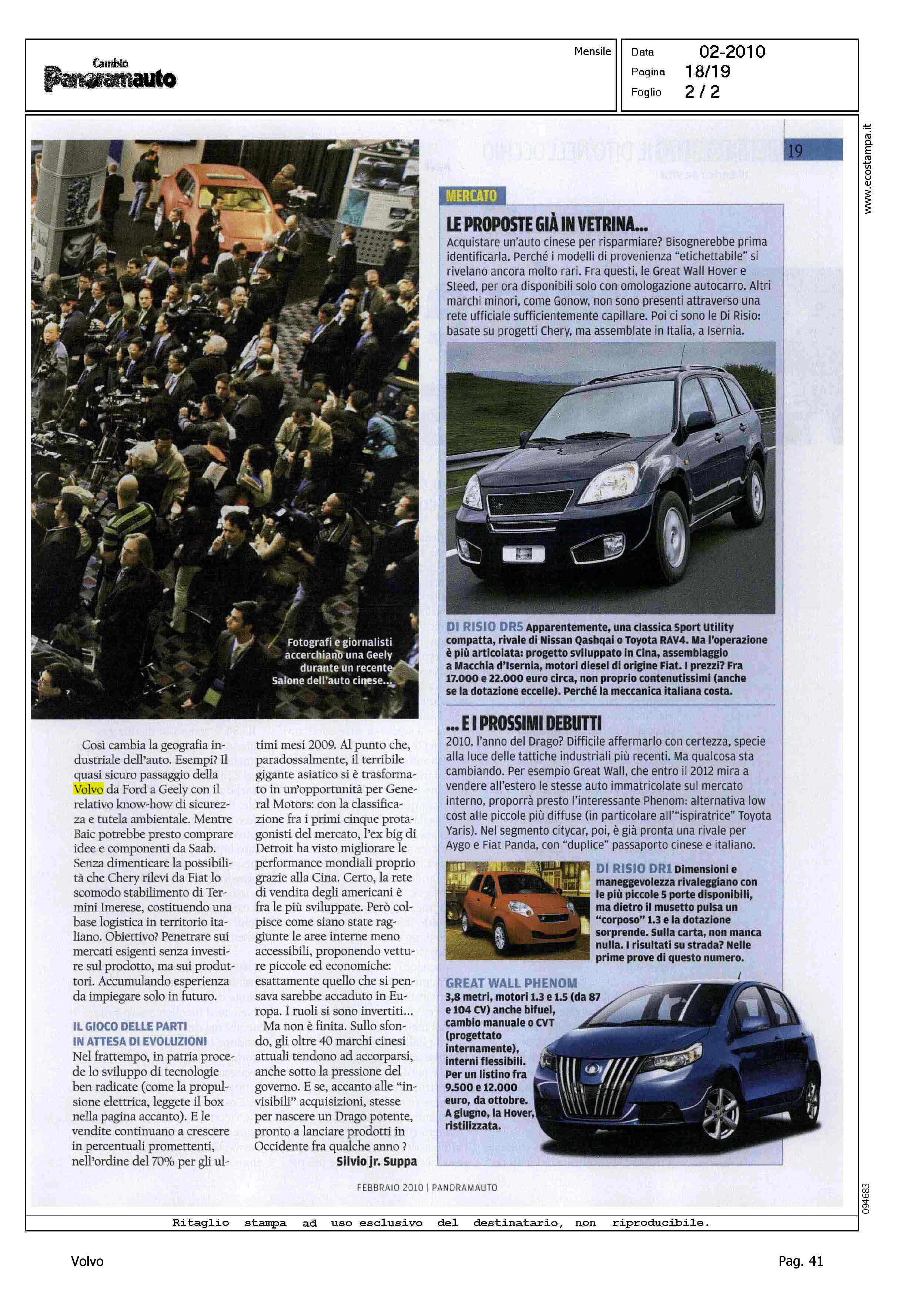 Author: SUPPA, SILVIO Jr.Line: Corporate Model: Corporate Subject: - Title: LA CINA NON E' VICINAHighlight: VENDITA VOLVO ALLA GEELY - SERVIZIO DUE PAGINE SU ALLEANZE E SCENARI AUTOMOTIVE CINA/EUROPA
