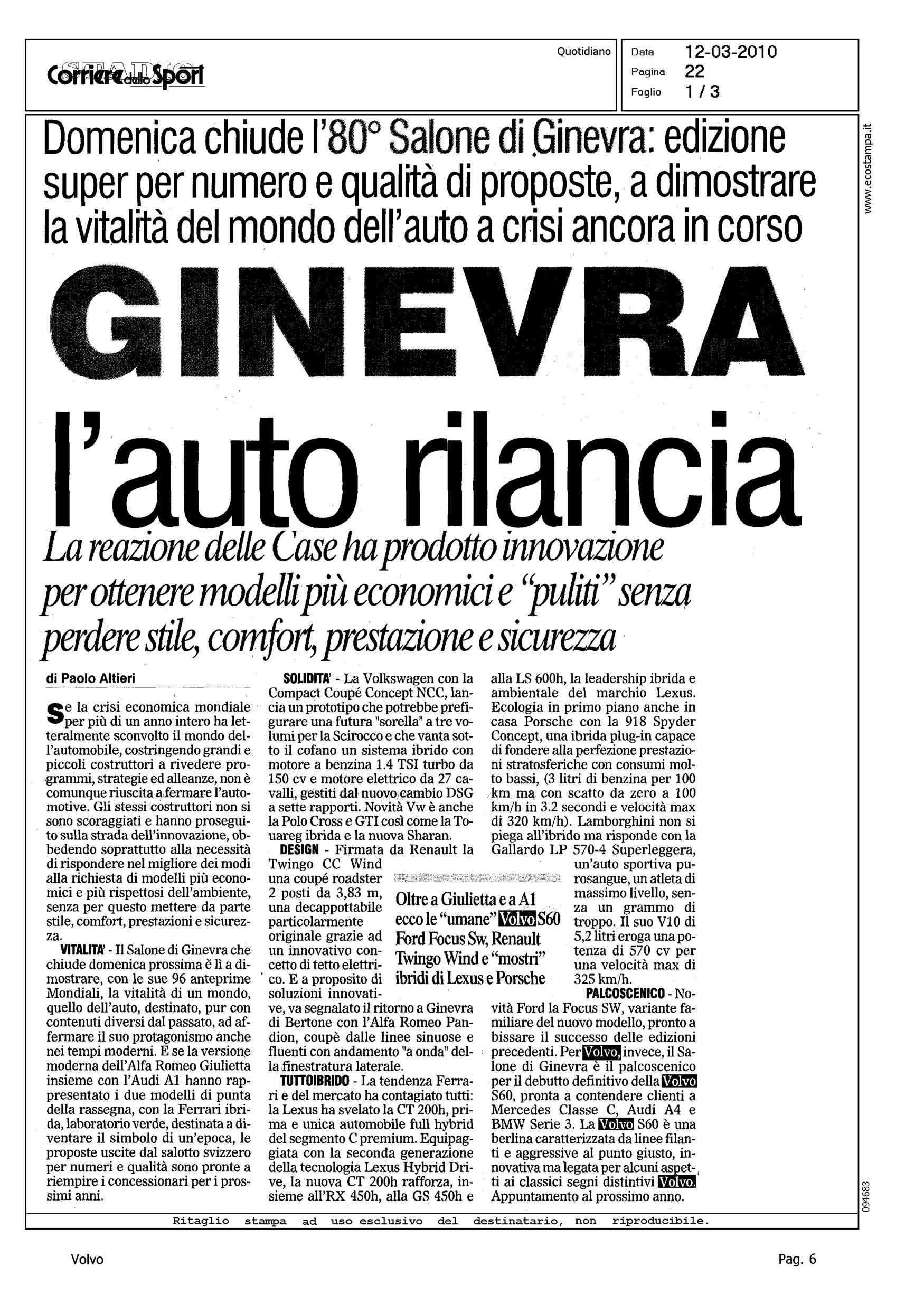 Author: ALTIERI, PAOLOLine: S60 Model: Linea S60 Show Subject: - Title: GINEVRA L'AUTO RILANCIAHighlight: GINEVRA - DESIGN - PROFILO DI MISSIONE - COMPETITOR, MB.CLASSE C, AUDI.A4, BMW.SERIE3