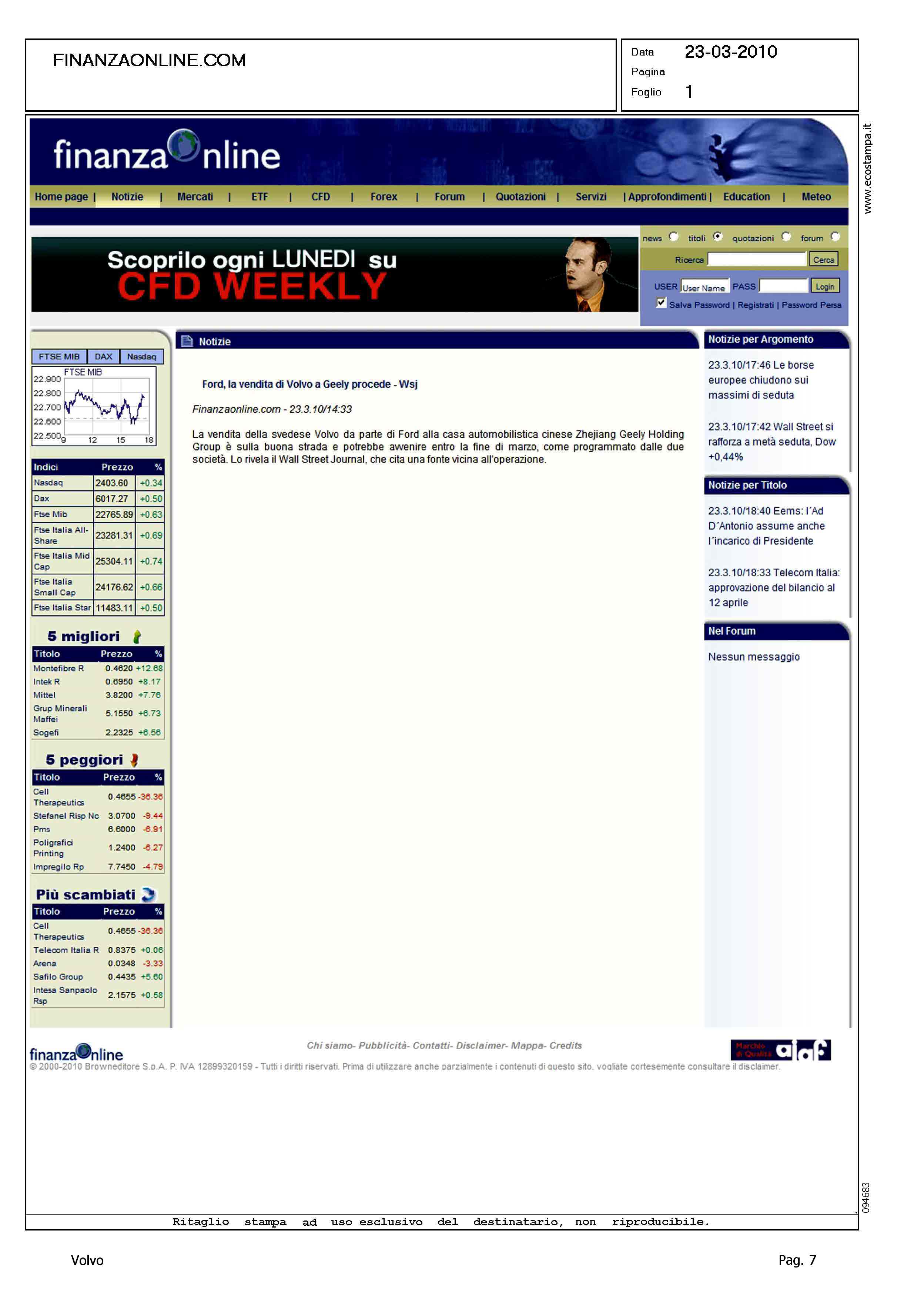 Author: Line: Corporate Model: Corporate Subject: - Title: FORD, LA VENDITA DI VOLVO A GEELY PROCEDEHighlight: VENDITA VOLVO ALLA GEELY