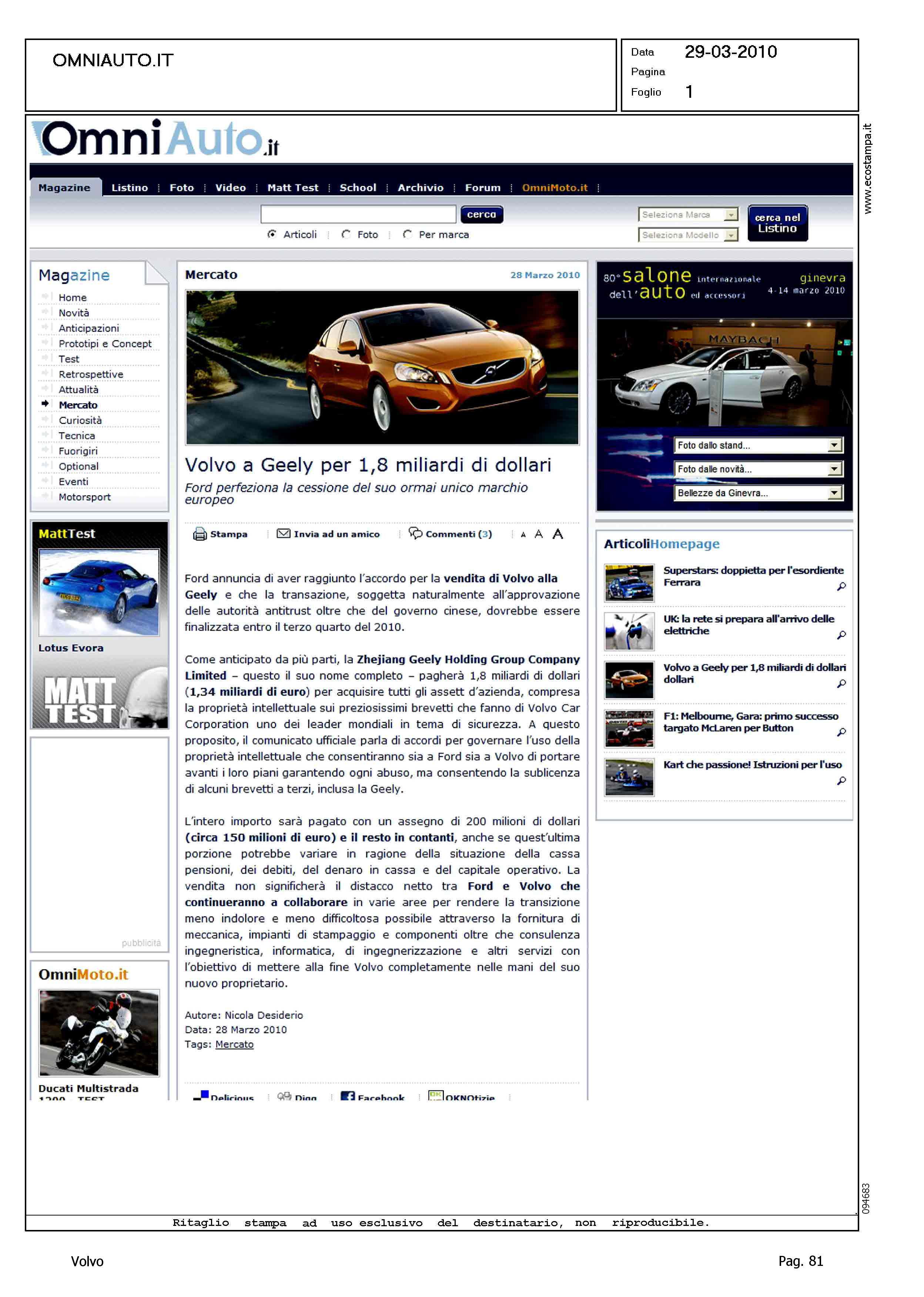 Author: DESIDERIO, NICOLALine: Corporate Model: Corporate Subject: - Title: VOLVO A GEELY PER 1,8 MILIARDI DI DOLLARIHighlight: VENDITA VOLVO A GEELY