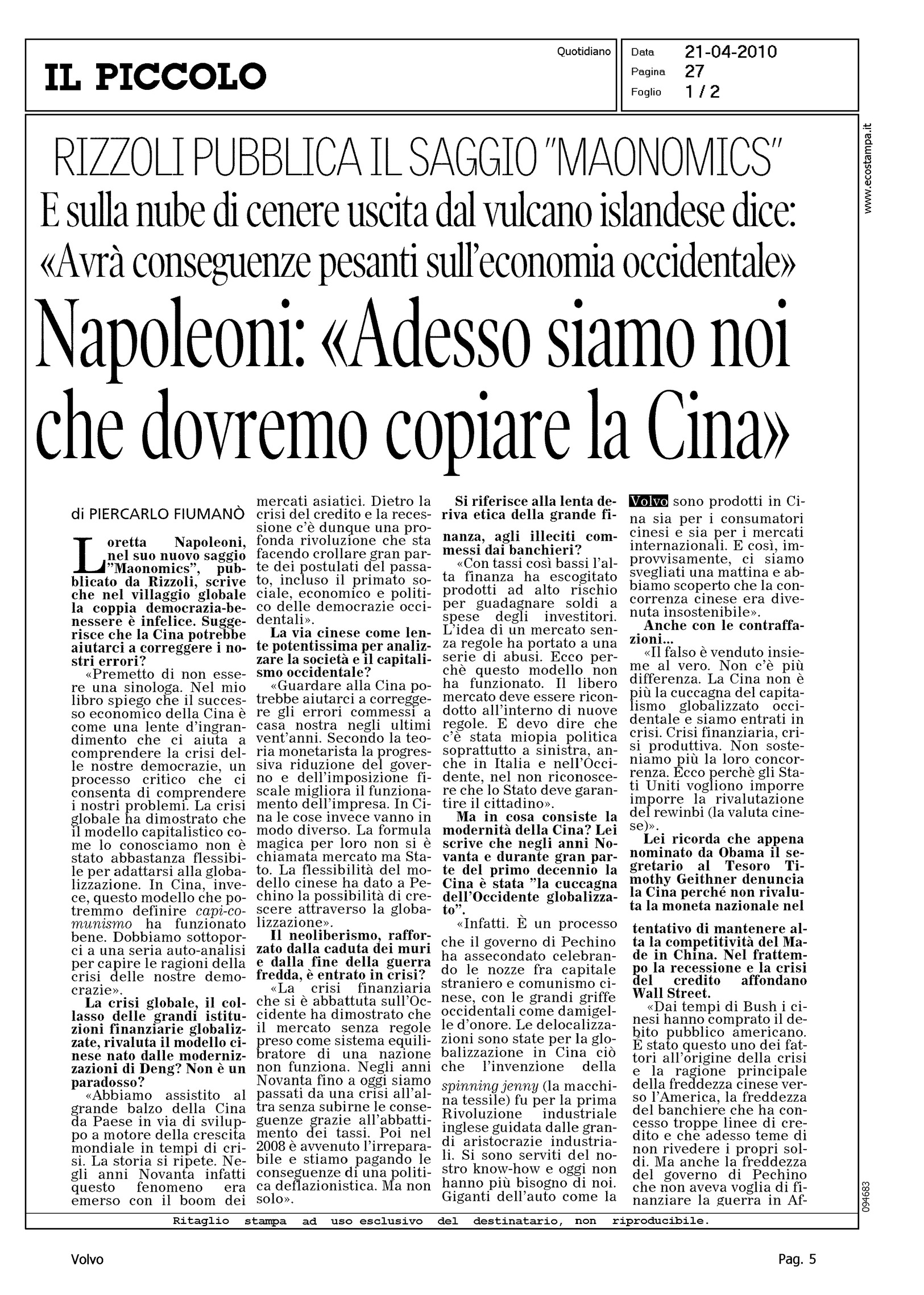 Author: FIUMANO', PIERCARLOLine: Corporate Model: Corporate Subject: - Title: NAPOLEONI: "ADESSO SIAMO NOI CHE DOVREMO COPIARE LA CINA"Highlight: CITAZIONE IN SCENARI ECONOMIA