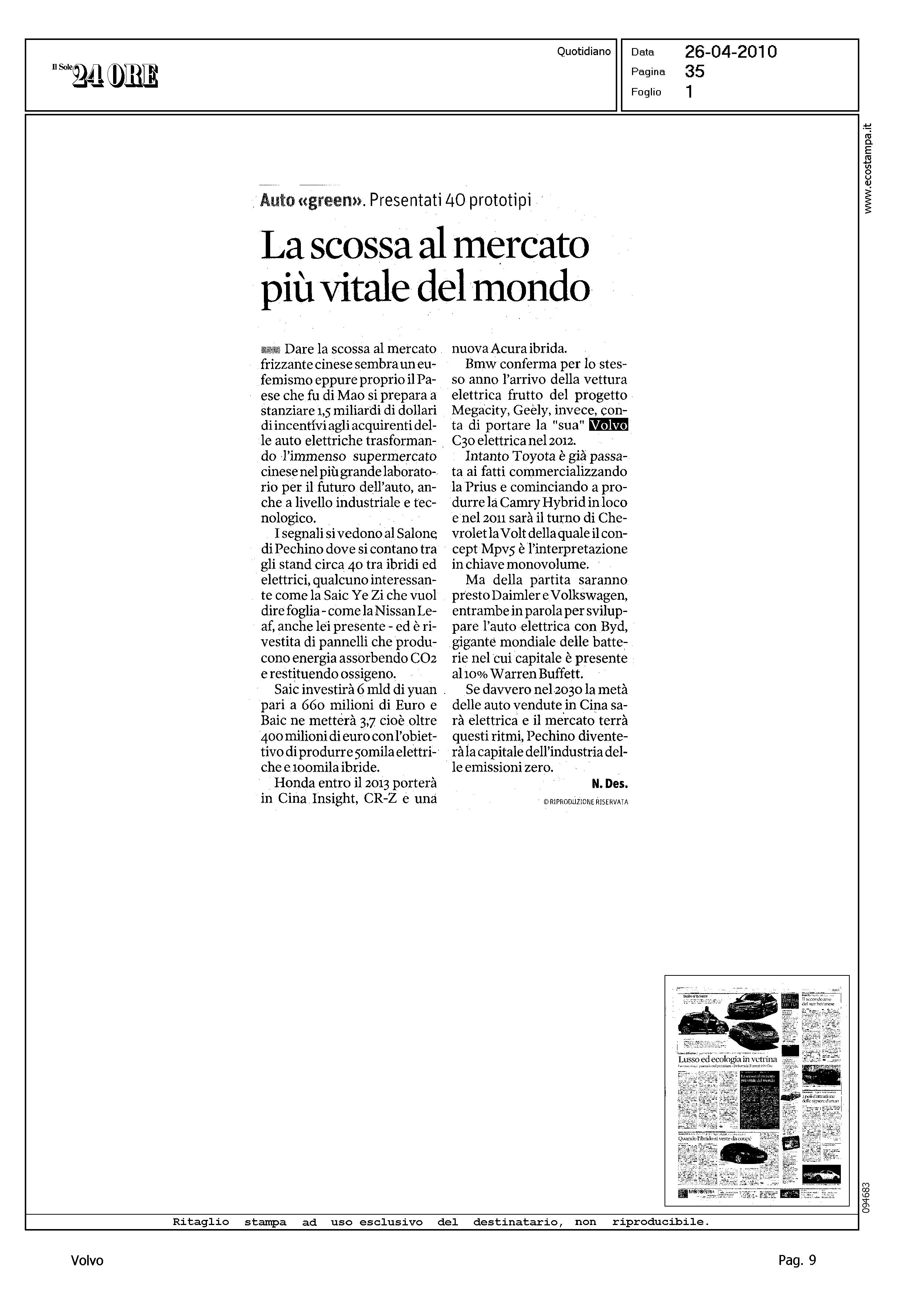 Author: DESIDERIO, NICOLALine: Corporate Model: Volvo C30 Subject: - Title: LA SCOSSA AL MERCATO PIU' VITALE DEL MONDOHighlight: (SALONE DI PECHINO) - SCENARI INDUSTRIALI - VOLVO C30 ELETTRICA NEL 2012