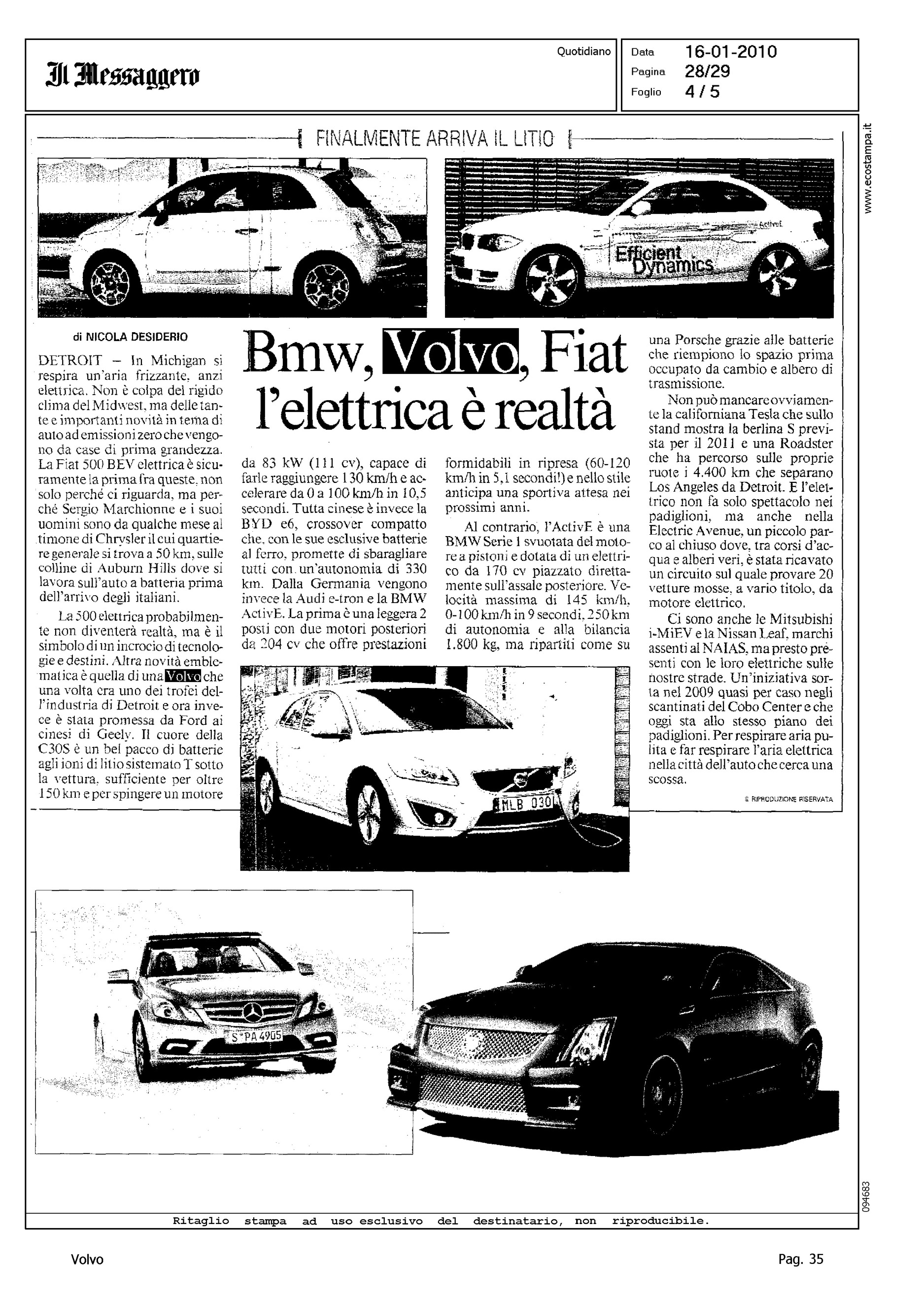 Author: DESIDERIO, NICOLALine: Corporate Model: Volvo C30 Subject: - Title: BMW, VOLVO, FIAT L'ELETTRICA E' REALTA'Highlight: AUTONOMIA - POTENZA - PRESTAZIONI