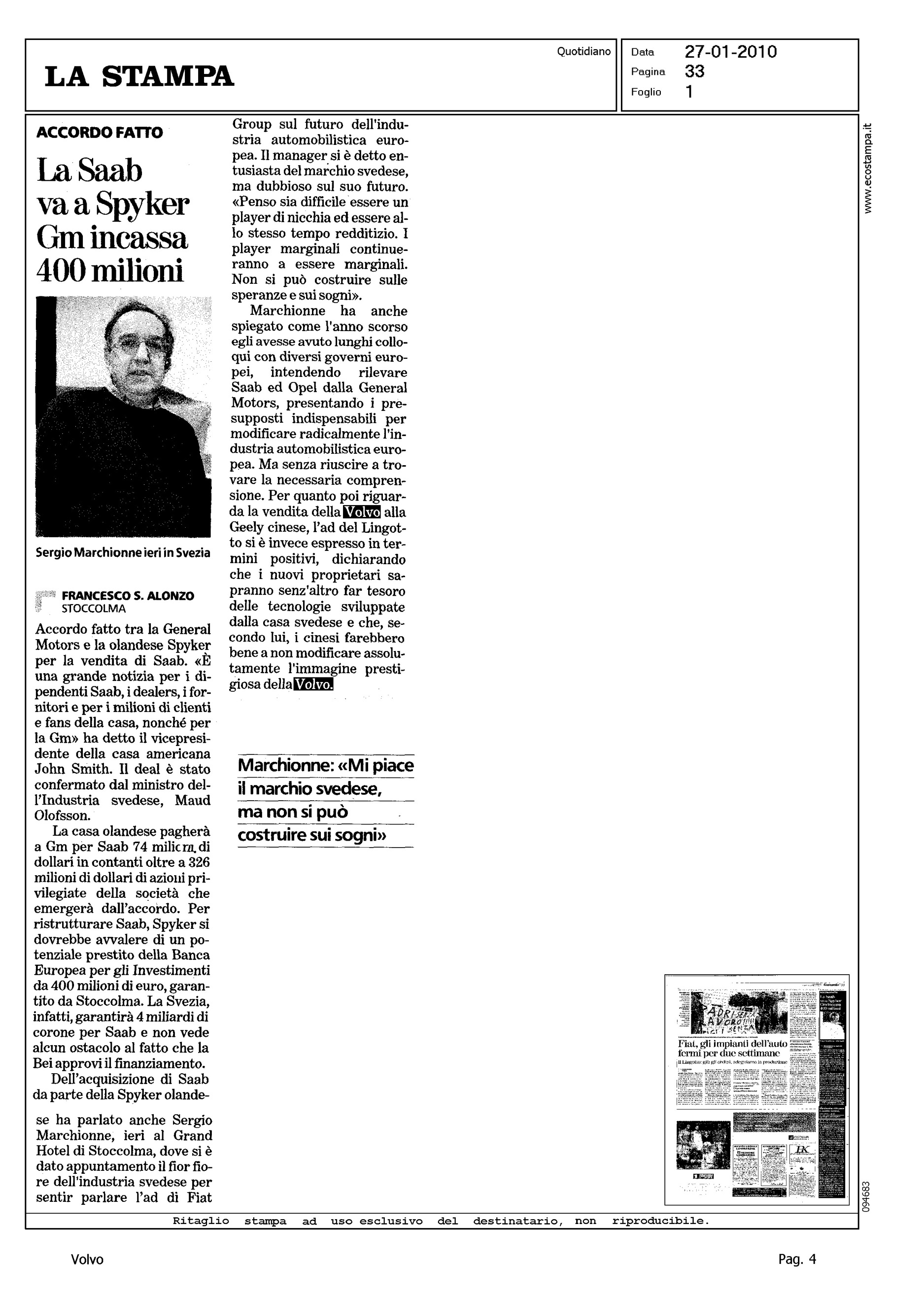 Highlight: POSIZIONE MARCHIONNE SU VENDITA VOLVO ALLA GEELY, SVILUPPO POSITIVO SE NON MODIFICATA IMMAGINE MARCA (in corrispondenza da Stoccolma su vendita SAAB a Spyker)