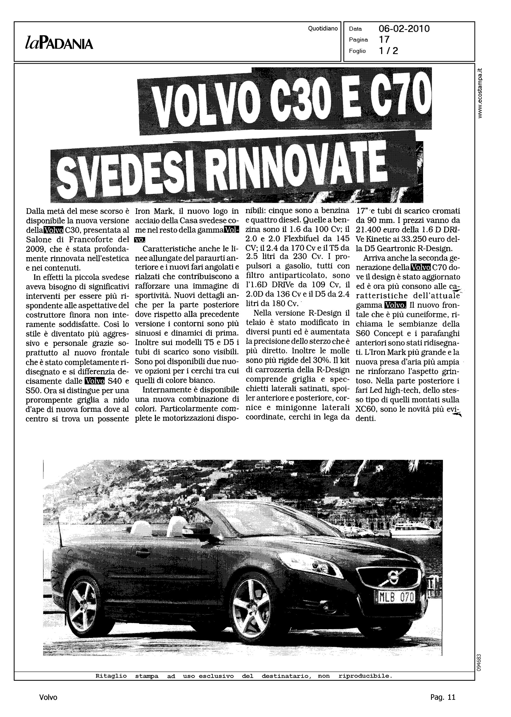 Author: Line: Corporate Model: Corporate Subject: - Title: VOLVO C30 E C70 SVEDESI RINNOVATEHighlight: DESIGN - MOTORI - PREZZI