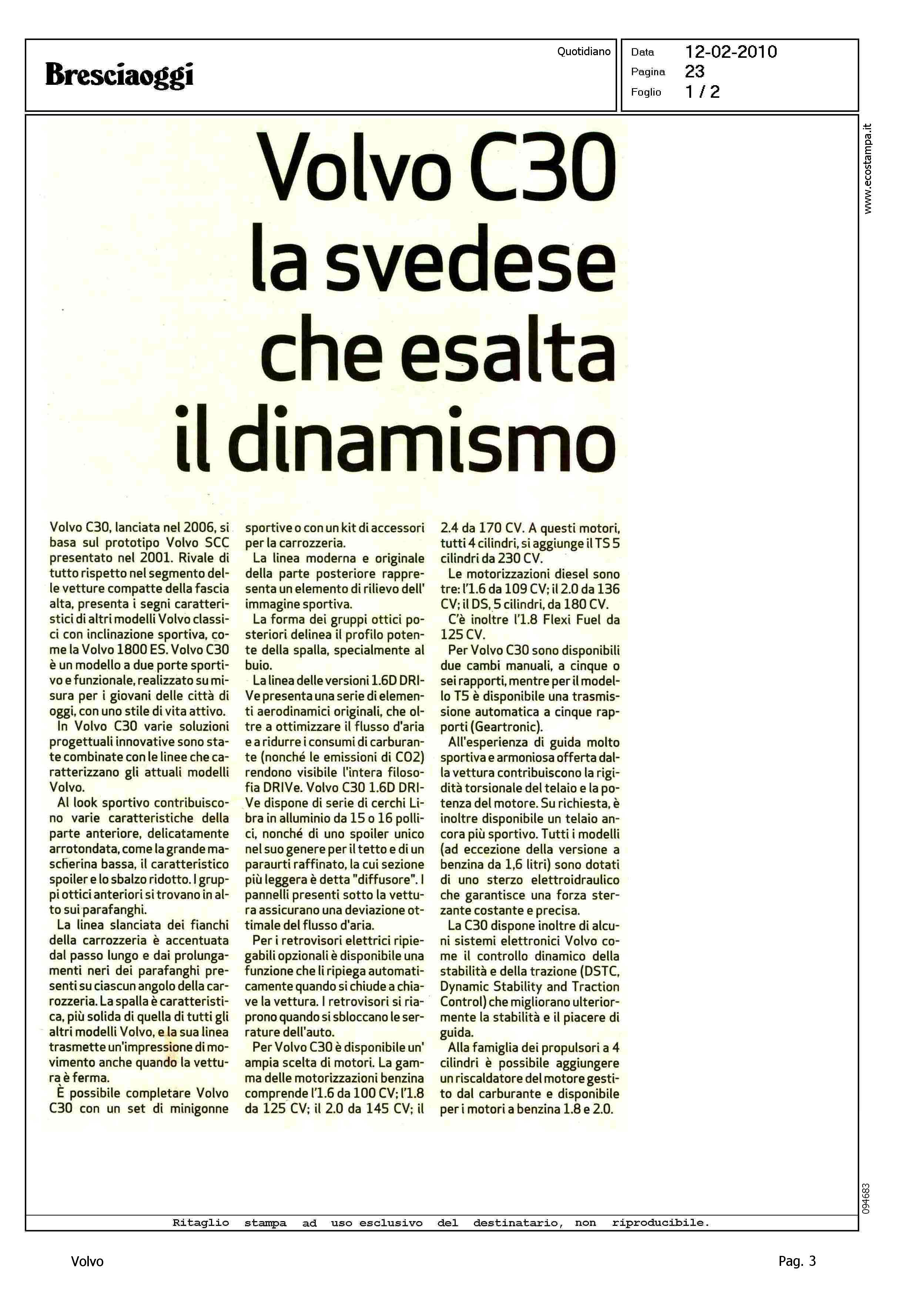 Author: Line: Corporate Model: Volvo C30 Subject: - Title: VOLVO C30 LA SVEDESE CHE ESALTA IL DINAMISMOHighlight: DESIGN - ALLESTIMENTI - STYLING KIT - DRIVe - MOTORI - CAMBIO - SICUREZZA - DINAMICA DI MARCIA