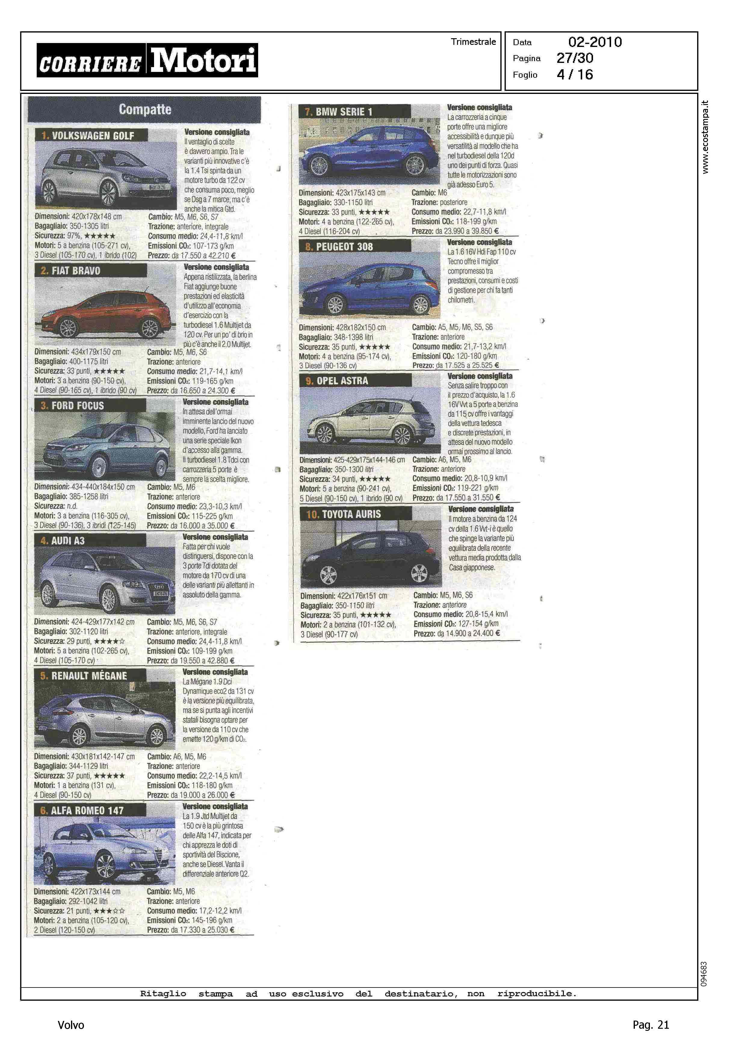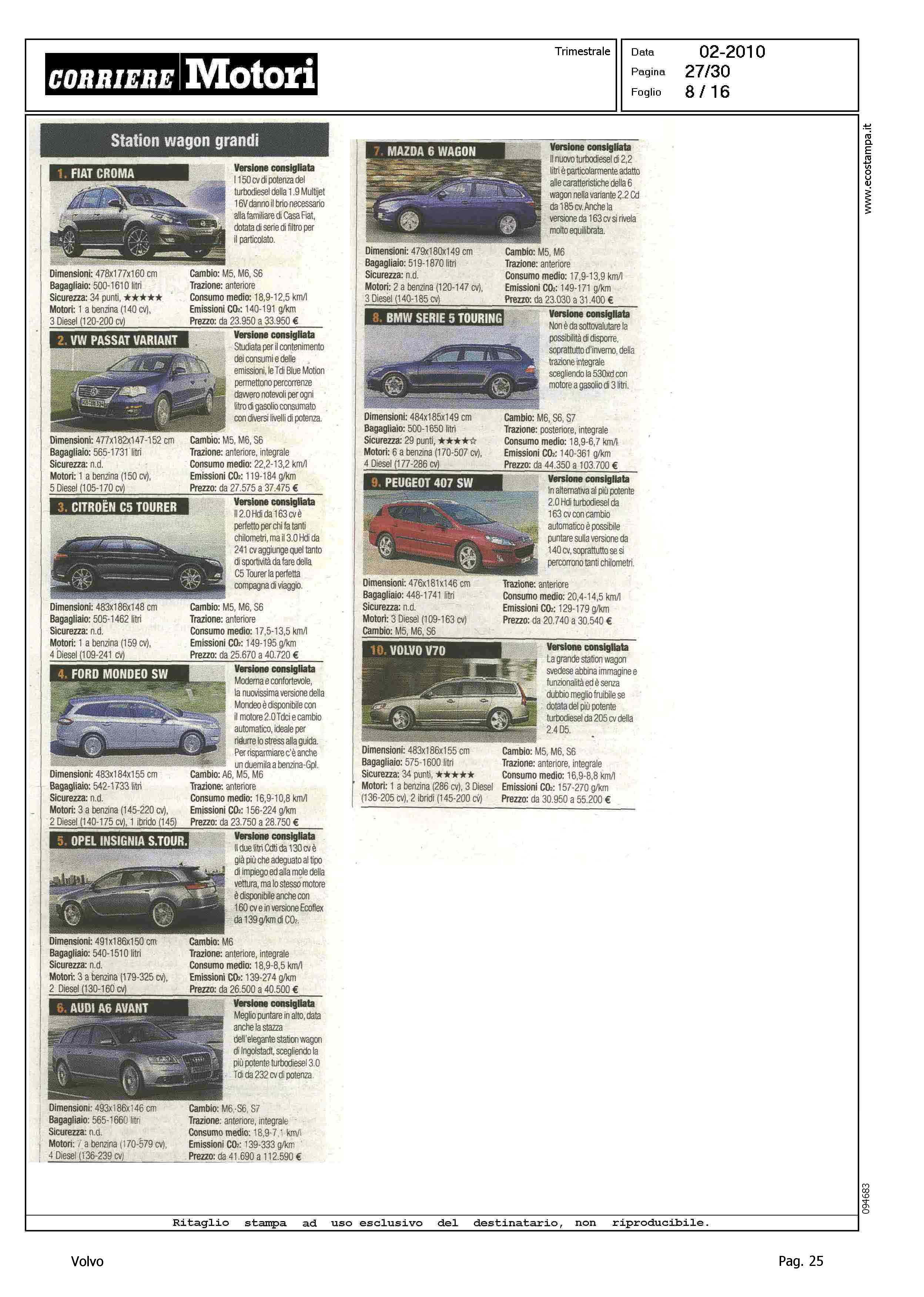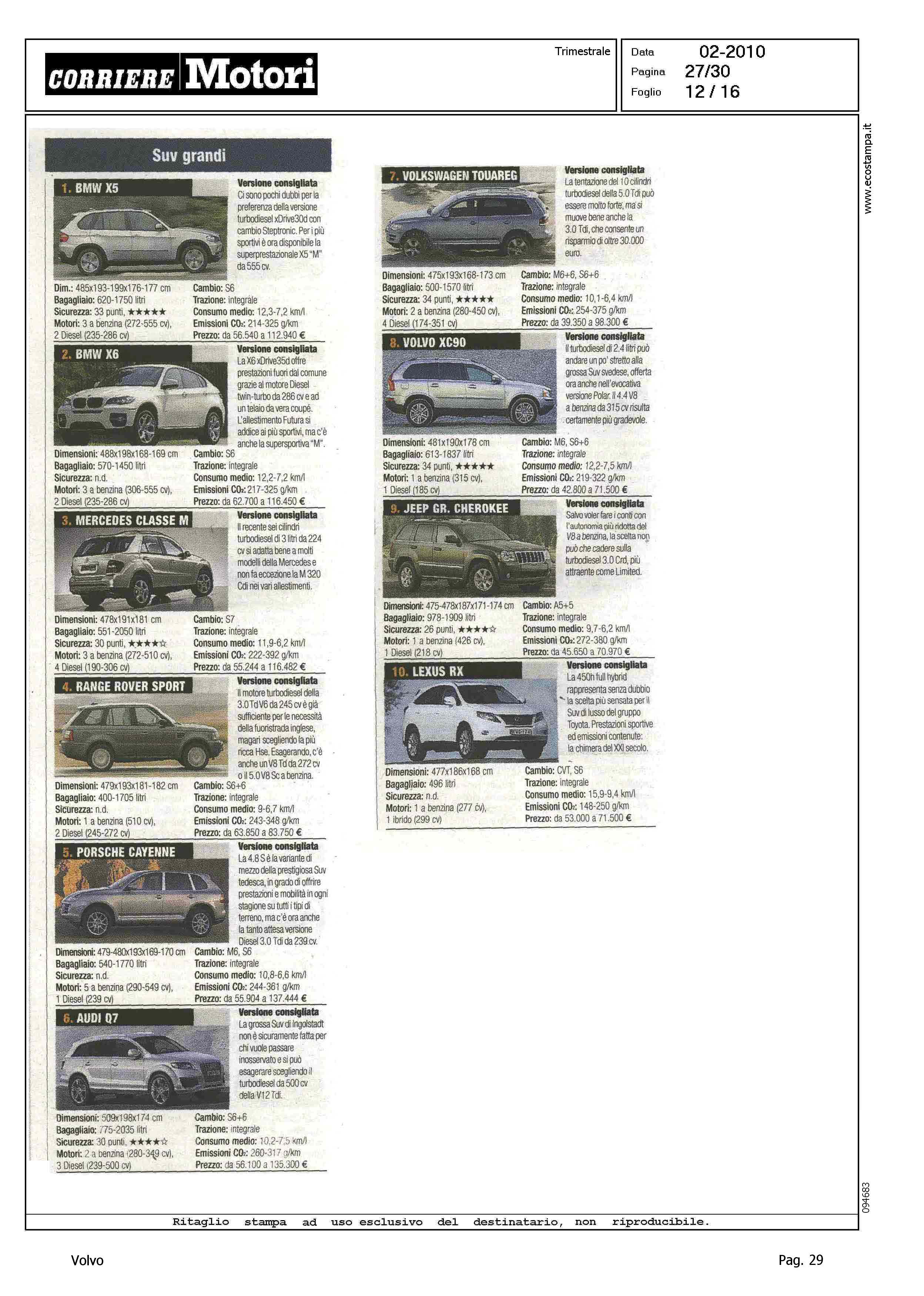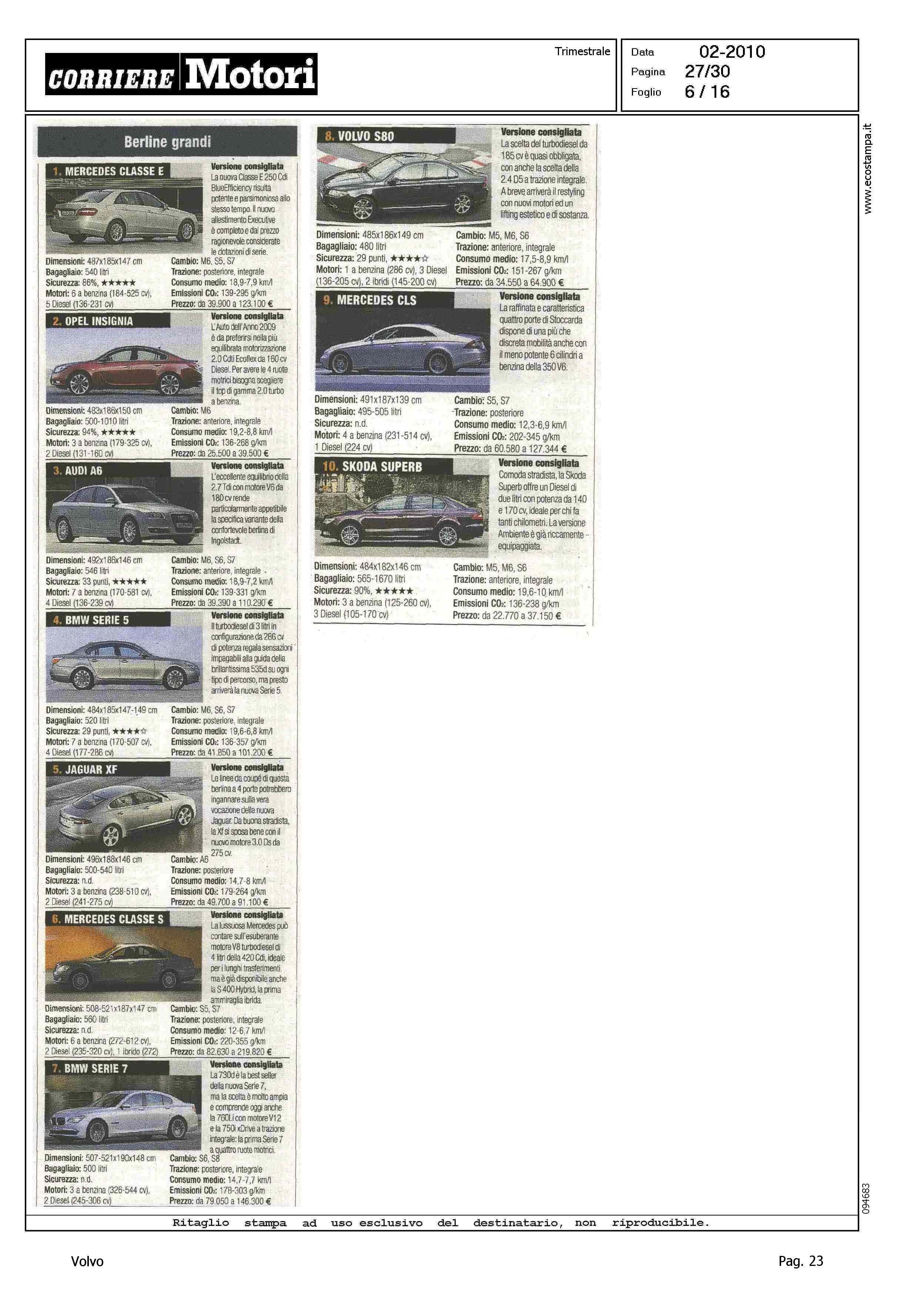 Highlight: CLASSIFICA MODELLI: BERLINE GRANDI, S80 (8) - STATION WAGON COMPATTE, V50 (8) - STATION WAGON GRANDI, V70 (10) - SUV GRANDI, XC90 (8)