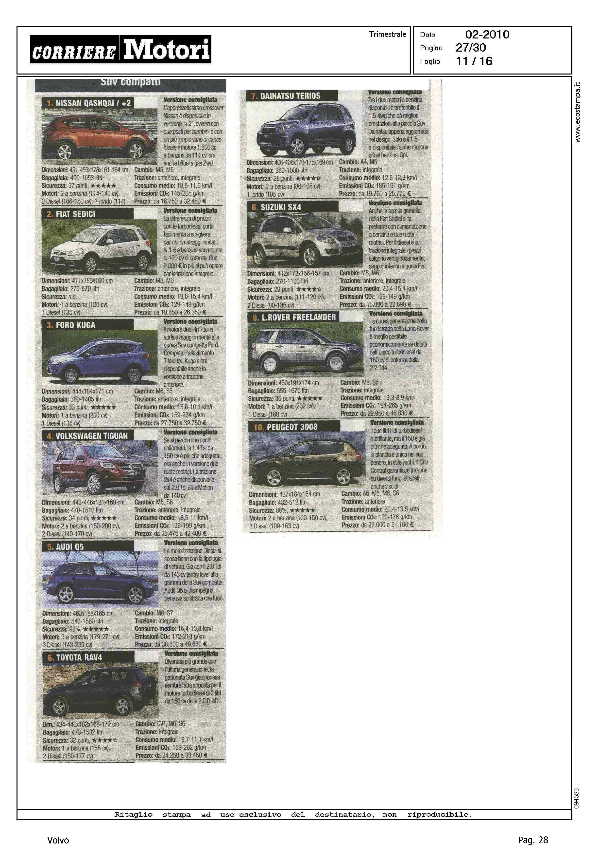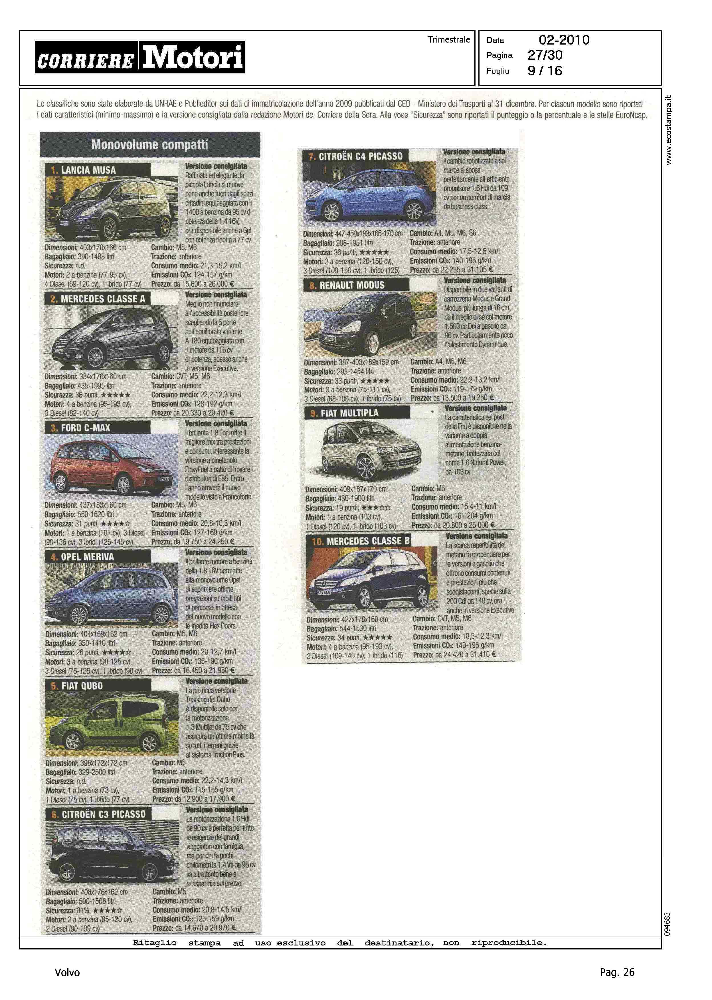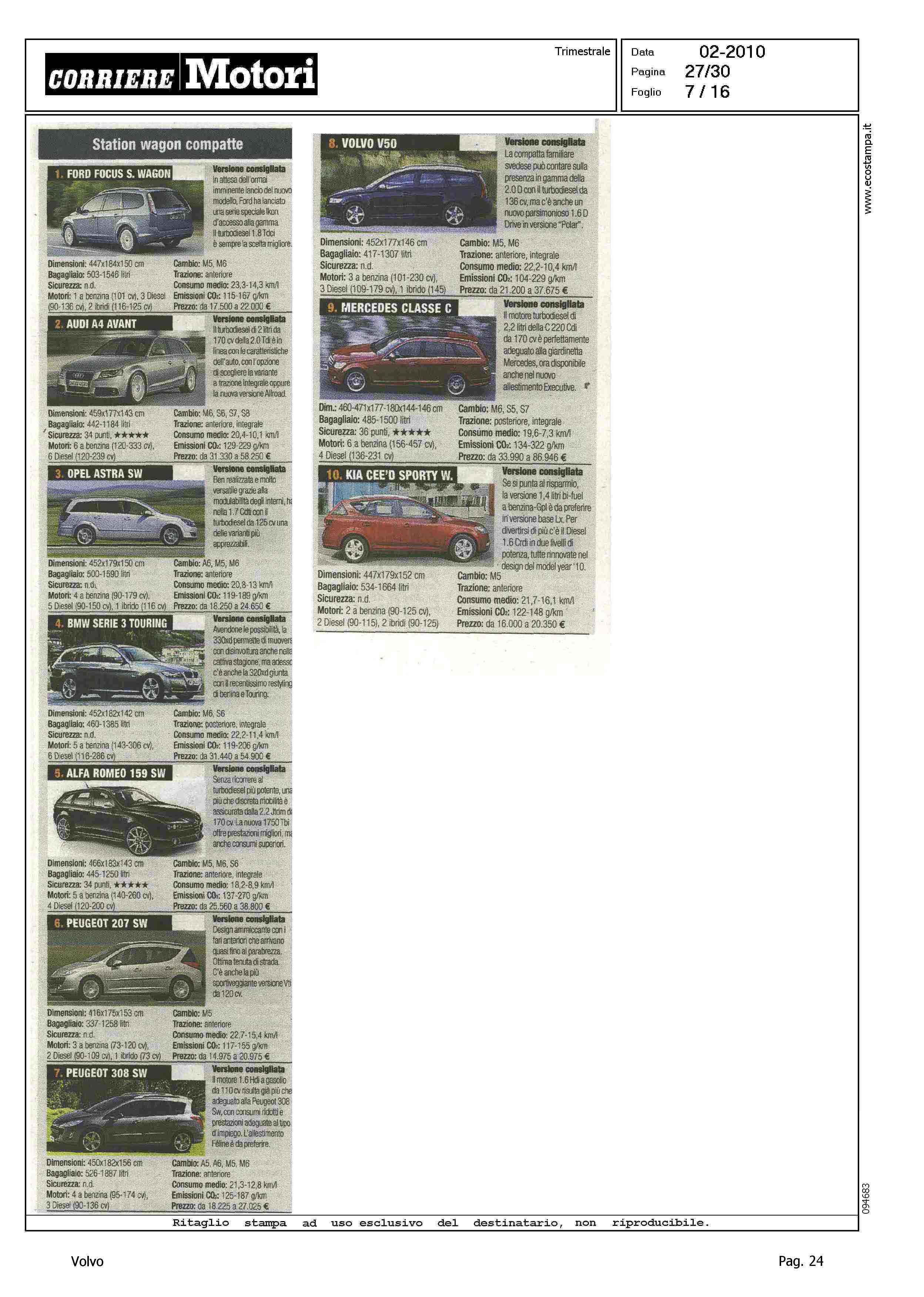 Highlight: CLASSIFICA MODELLI: BERLINE GRANDI, S80 (8) - STATION WAGON COMPATTE, V50 (8) - STATION WAGON GRANDI, V70 (10) - SUV GRANDI, XC90 (8)